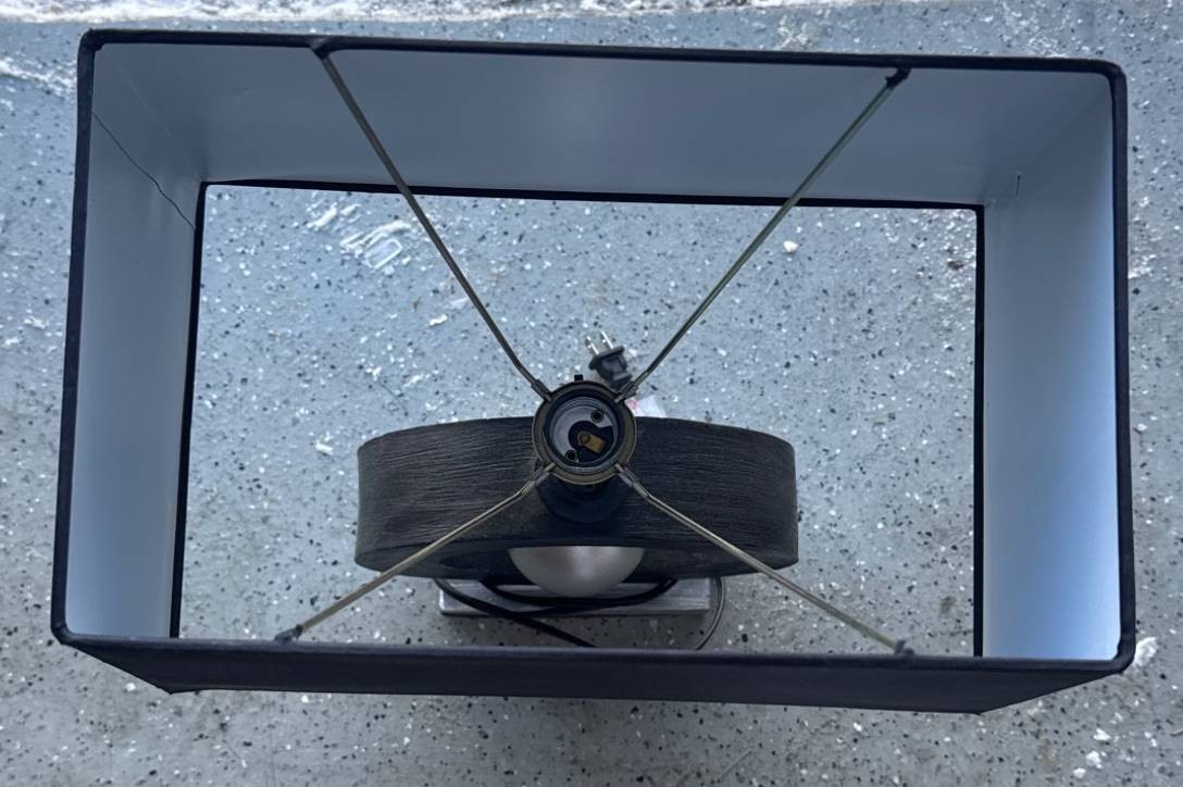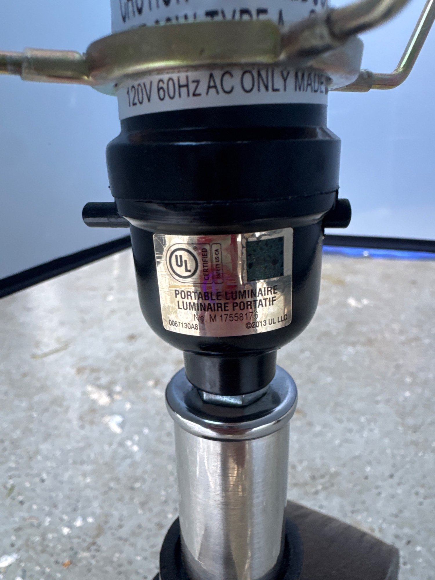 Portable table lamp featuring a circular black base with a metallic silver sphere accent in the center. Equipped with a rectangular black fabric shade and standard electrical wiring. Includes a UL-certified sticker on the socket. Base dimensions are approximately 10 inches in height and 7 inches in width, with an overall lamp height of 18 inches including the shade.