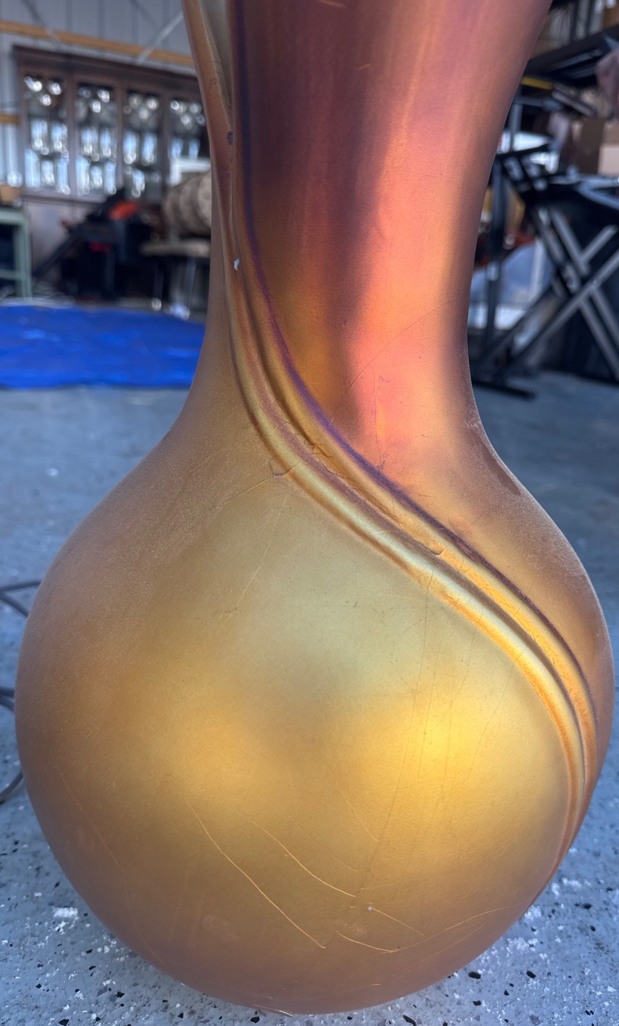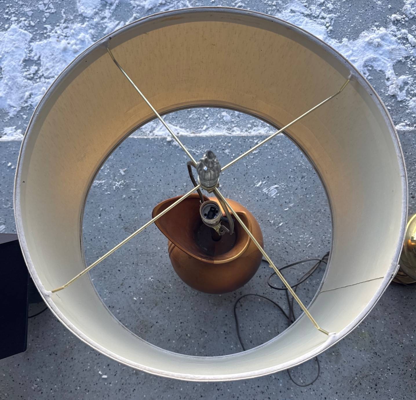 Modern table lamp featuring a sculptural gold and bronze-colored abstract base with flowing curves and striations. The upper section holds a drum-shaped fabric shade in a neutral tone. The lamp includes a standard electrical cord for operation. Minor surface scratches are visible on the base. Dimensions: Approx. 24 inches tall, 15 inches in shade diameter, and 7 inches at the base width.