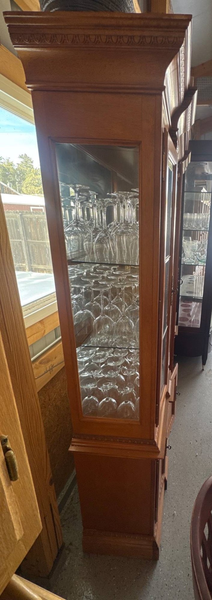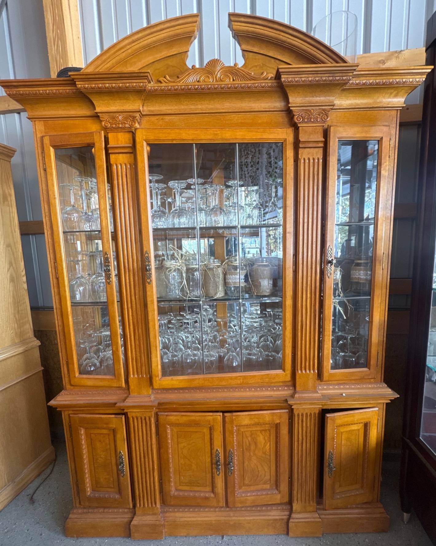 A large oak china cabinet featuring an arched pediment with carved accents. The cabinet includes three front glass panel doors and two side glass panels, offering display shelves for glassware or collectibles. The base has four solid wood doors with metal hardware. The interior shelves are made of glass, and the back panel of the upper section is mirrored. Contents visible in the photo are not included. Approximate dimensions: 84 in. H x 60 in. W x 18 in. D.