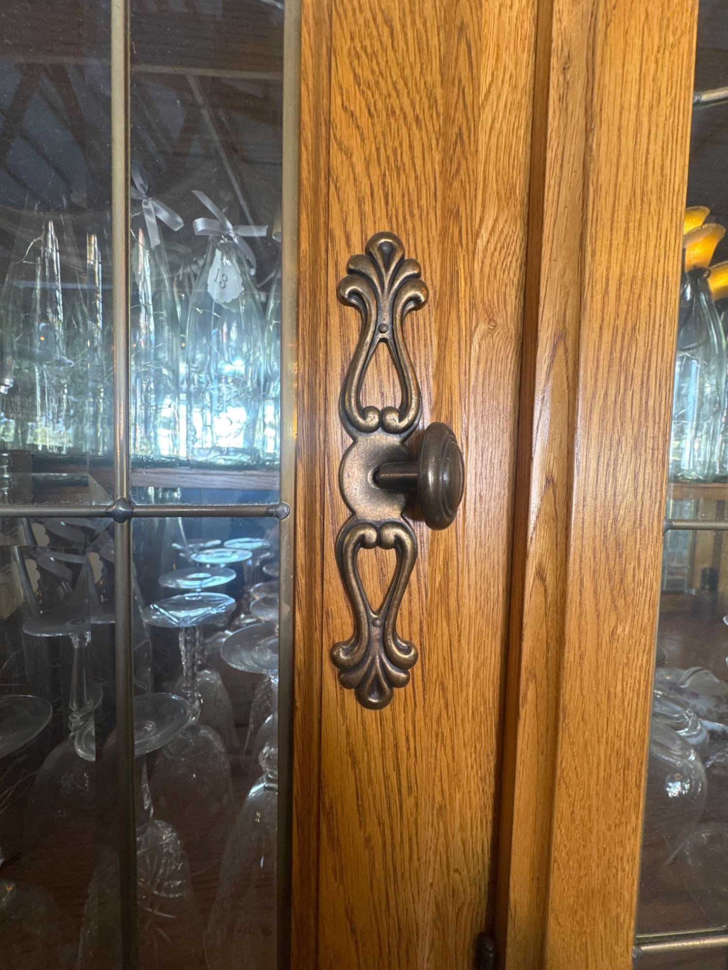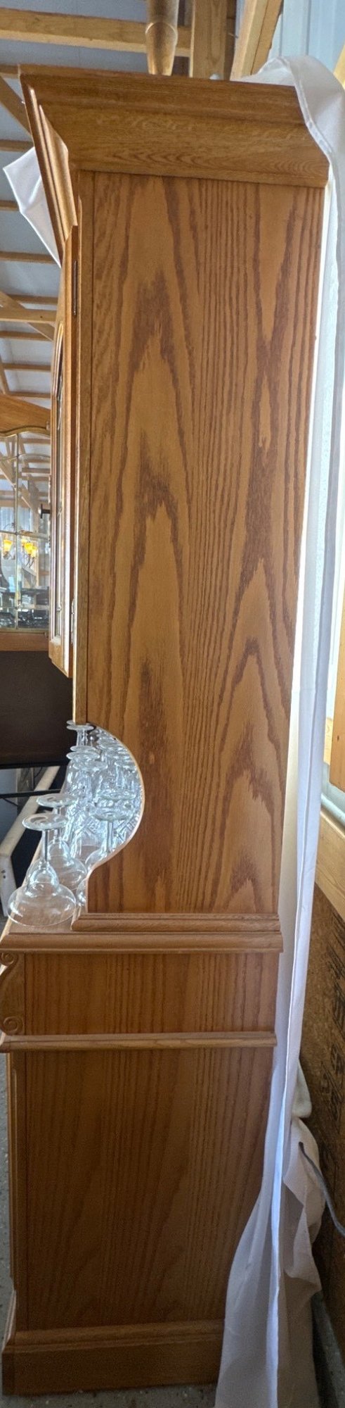 Two-piece oak china hutch featuring three upper glass-paneled doors with decorative mullions and brass handles, above a lower cabinet with two side doors, three central drawers, and carved detailing. The upper section includes glass shelving for display purposes. Contents not included. Dimensions: approximately 80 inches tall, 50 inches wide, and 18 inches deep.