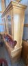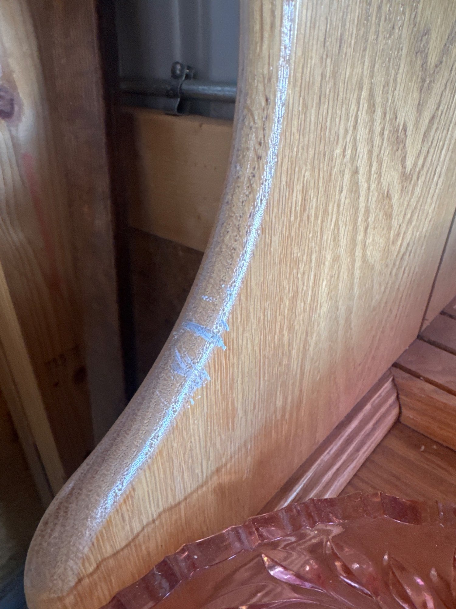 Oak wood china cabinet featuring three glass-front upper doors with arched detailing, enclosing display shelves. The base includes three drawers and three cabinet doors with paneling for enclosed storage. Notable scratch on the side panel of the hutch. Approximate dimensions: 72 inches H x 56 inches W x 18 inches D. Contents not included.