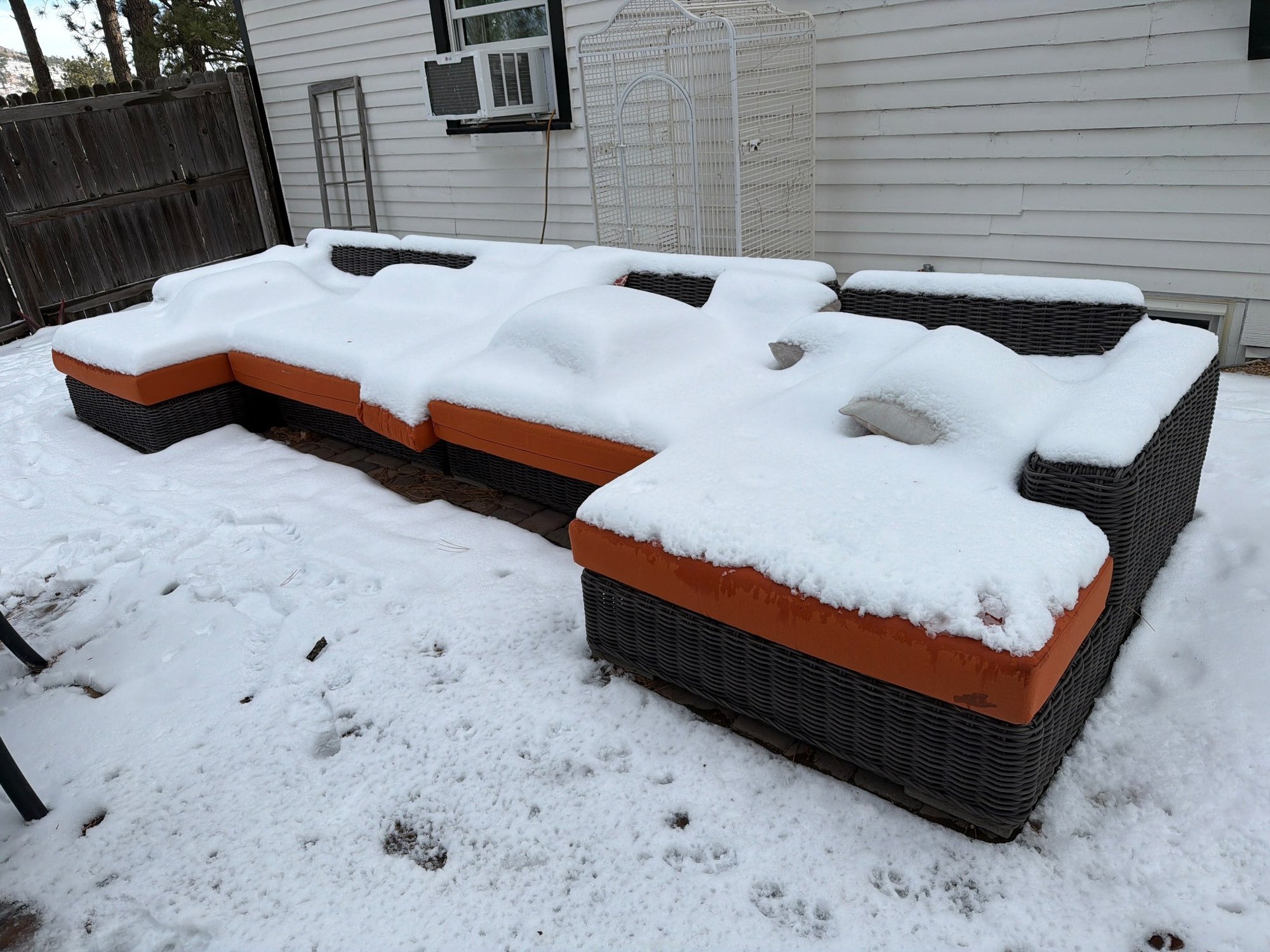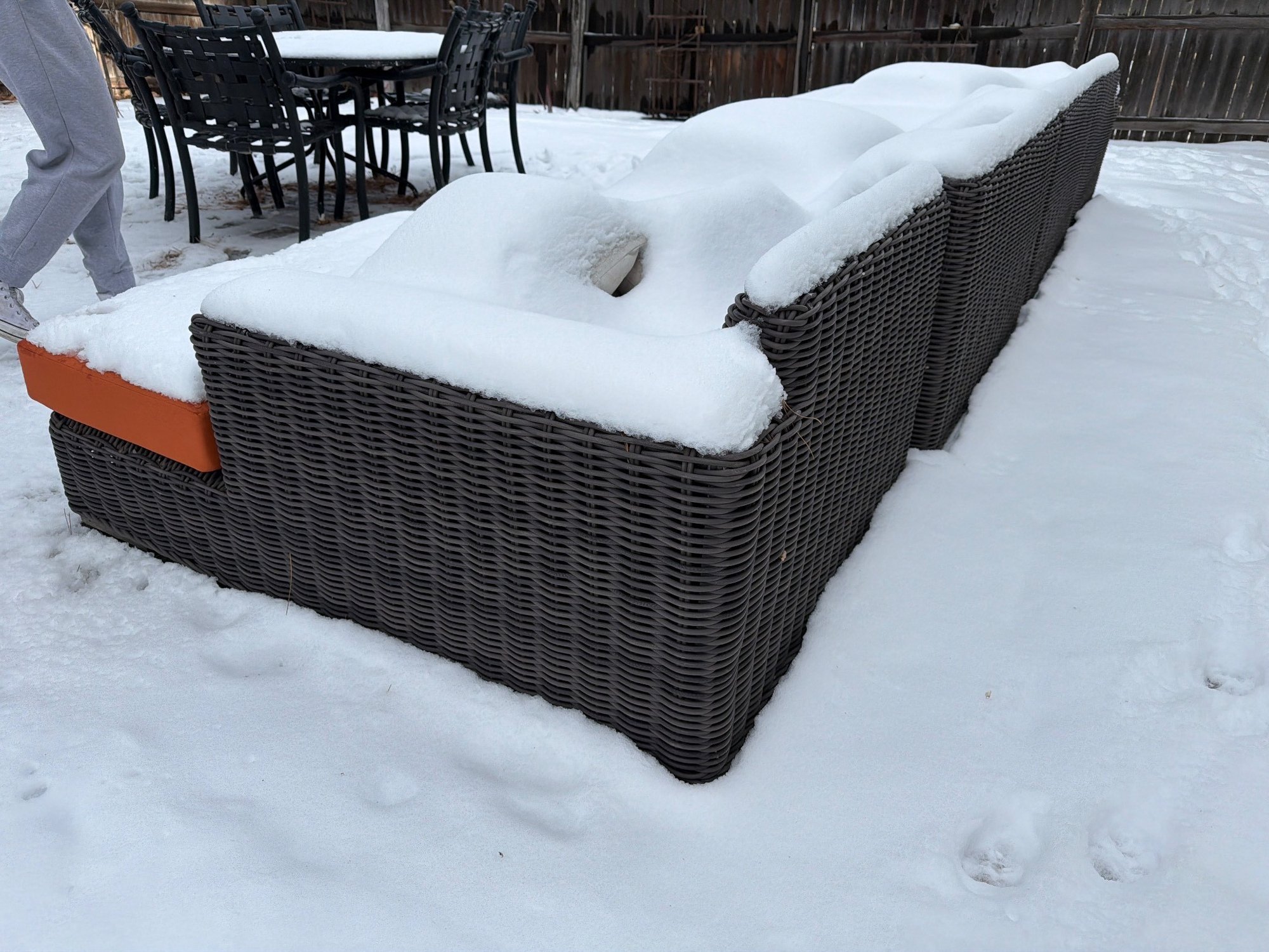 An outdoor modular patio sofa constructed from woven synthetic wicker with a dark brown finish. The sofa features multiple sections for a customizable arrangement. Each section includes orange cushions for seating comfort. The piece is designed for outdoor use and shows weather exposure.