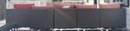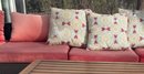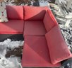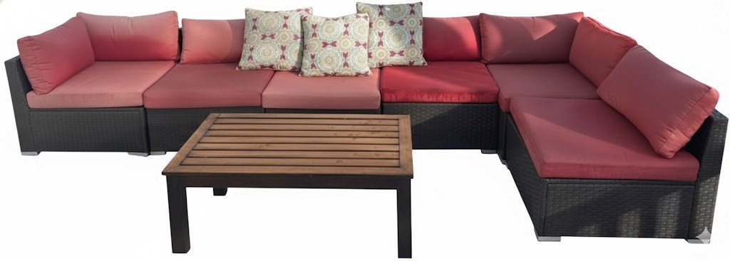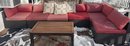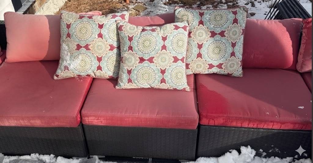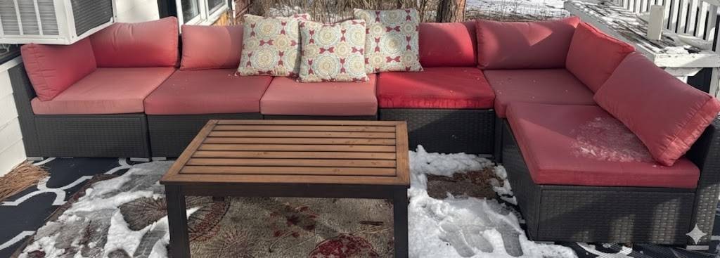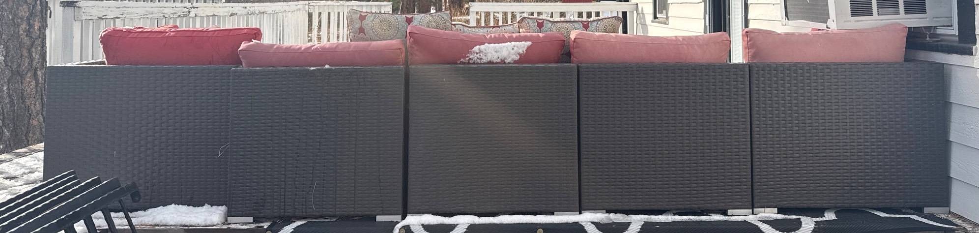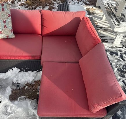 Outdoor patio sectional set including a modular rattan-style sofa with red cushions and three patterned throw pillows. Sofa sections are arranged in an L-shaped configuration. Includes a rectangular wooden slat coffee table with a metal frame. Cushions show weather exposure and snow is present on the surface. Dimensions: Sofa (individual sections approx. 25 x 25 inches each), Coffee Table (approx. 39 x 21 x 18 inches).