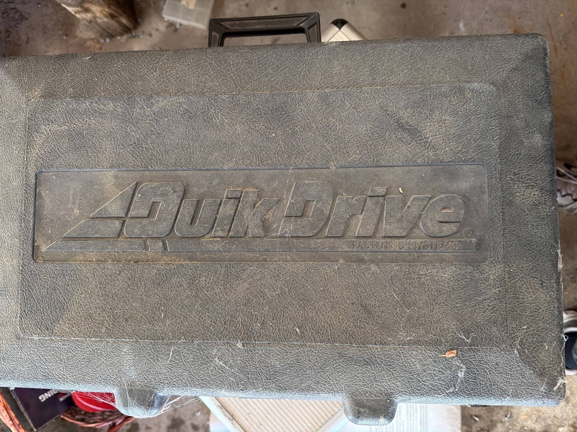 Quik Drive screw fastening system featuring a power tool with a yellow and black housing and attached cord. Includes original storage case and accompanying documentation. Case lid is branded with the ‘Quik Drive’ logo. Dimensions of the carrying case: approximately 20 inches wide, 9 inches deep, and 5 inches tall.