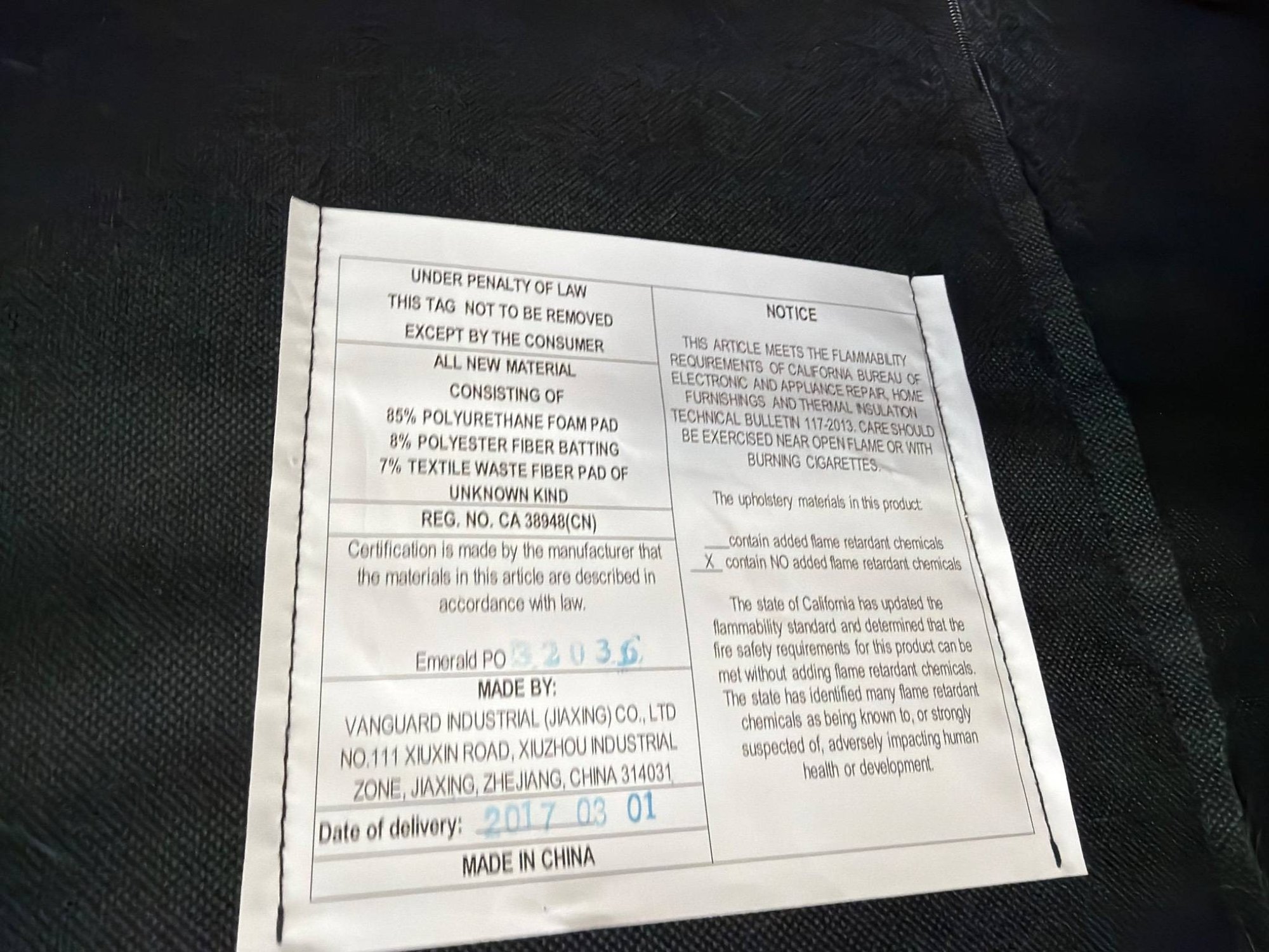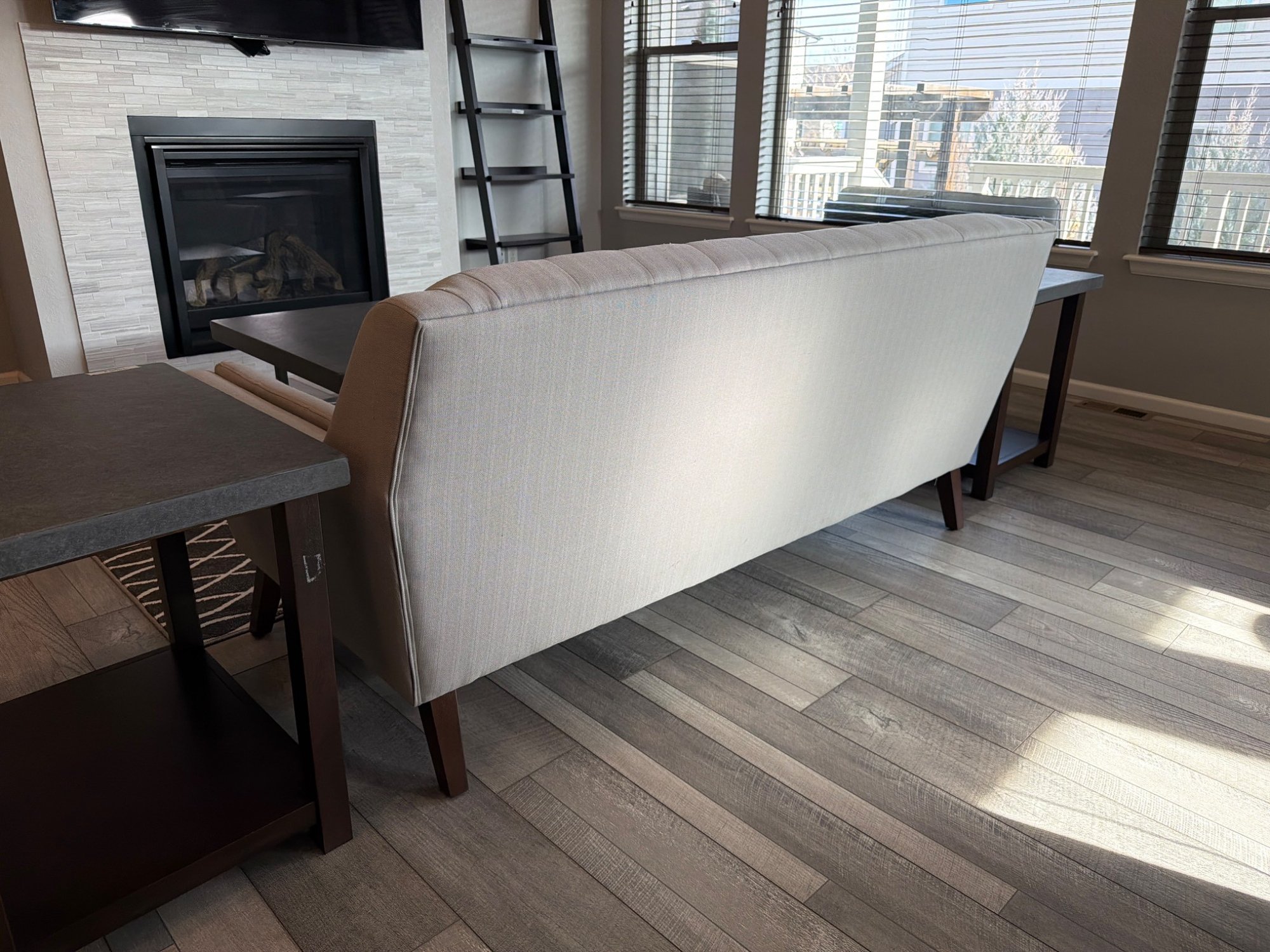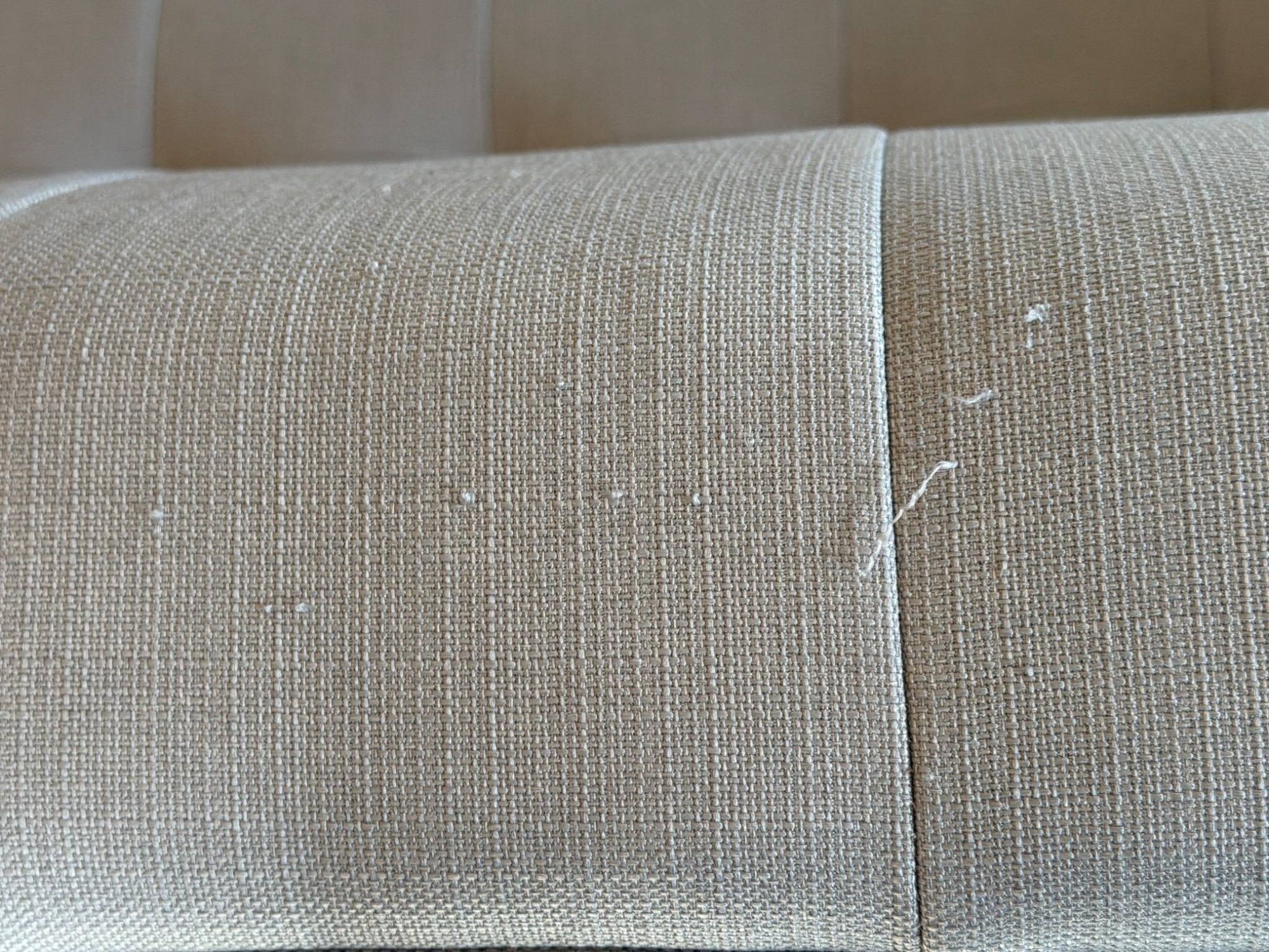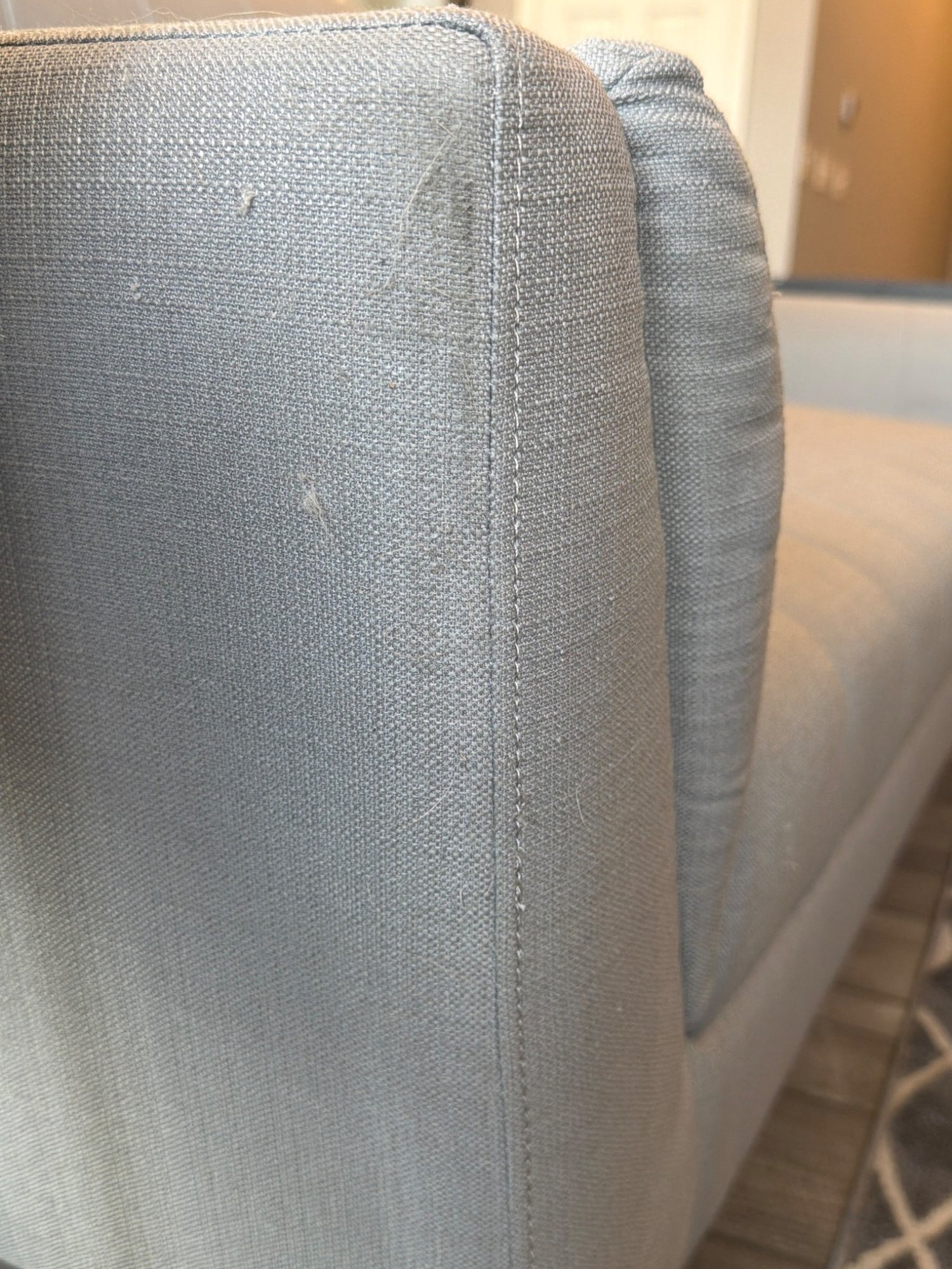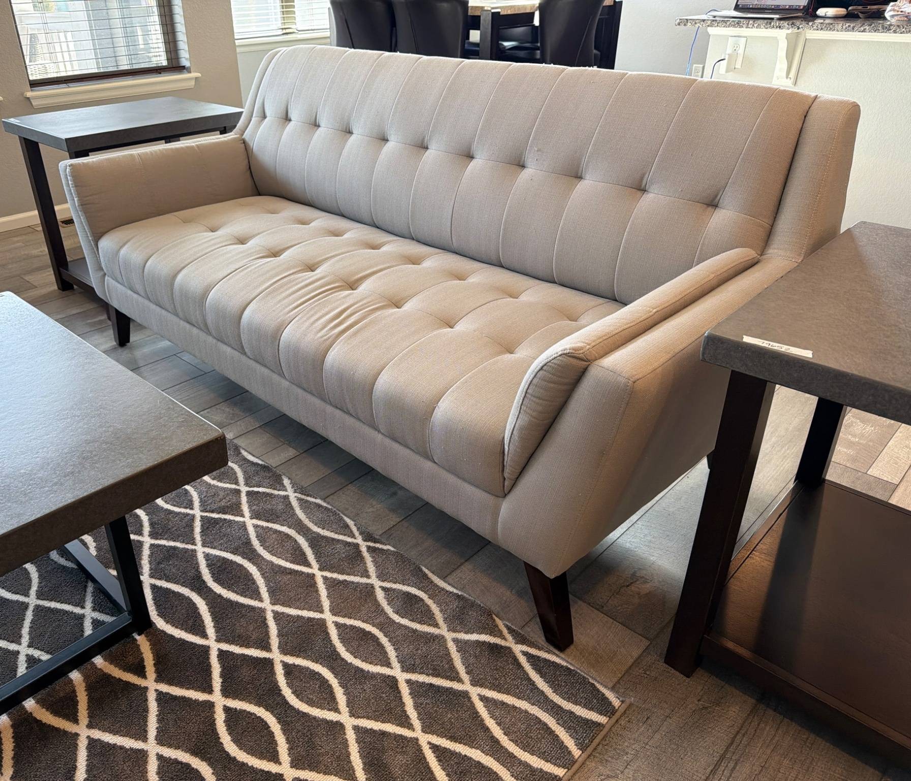 Gray upholstered sofa featuring a button-tufted backrest and seat with sloped armrests. Supported by dark wood tapered legs. Made in China, with minor wear and fabric marks visible on the upholstery. Dimensions are approximately 74 x 33 x 35.