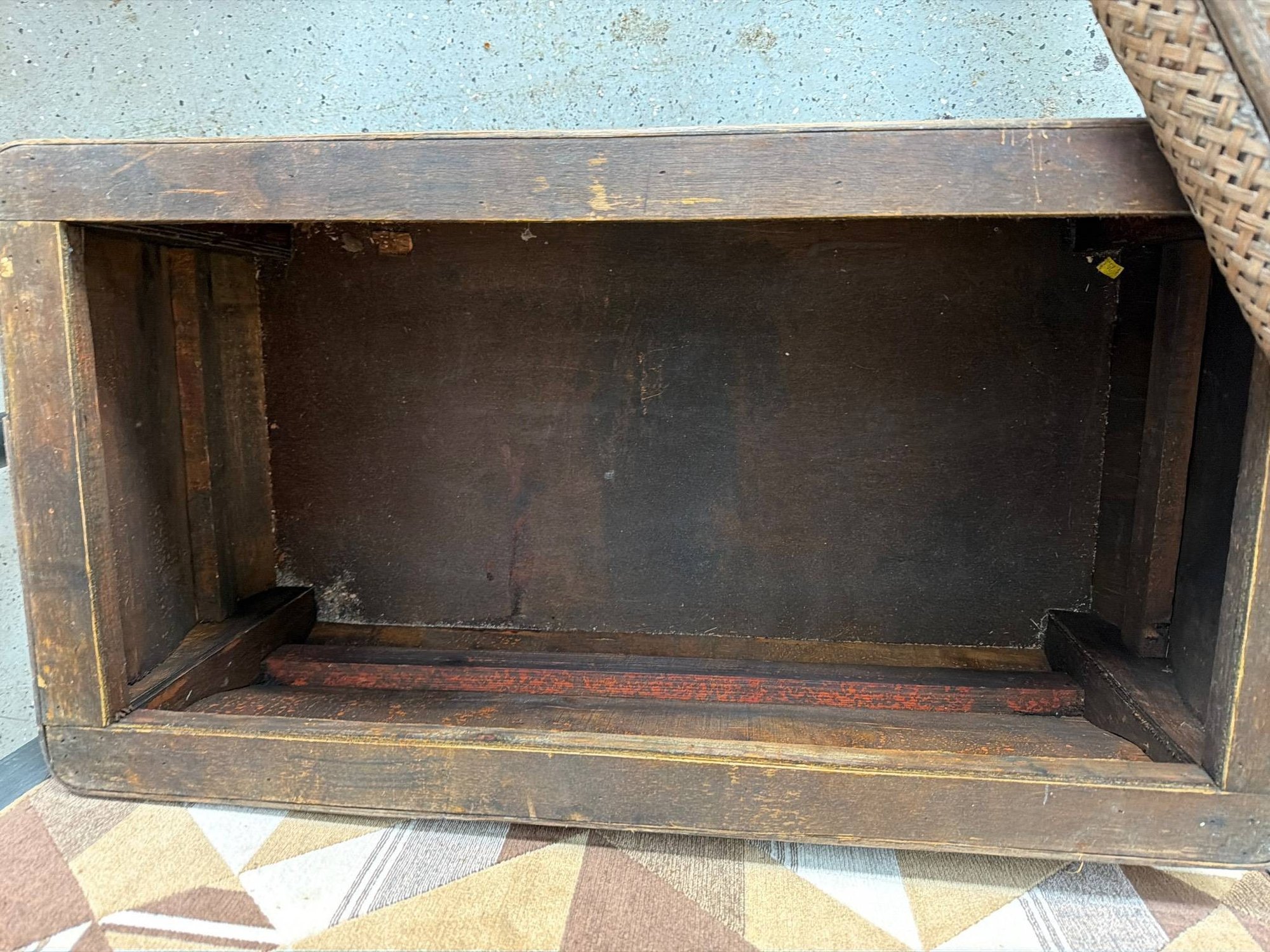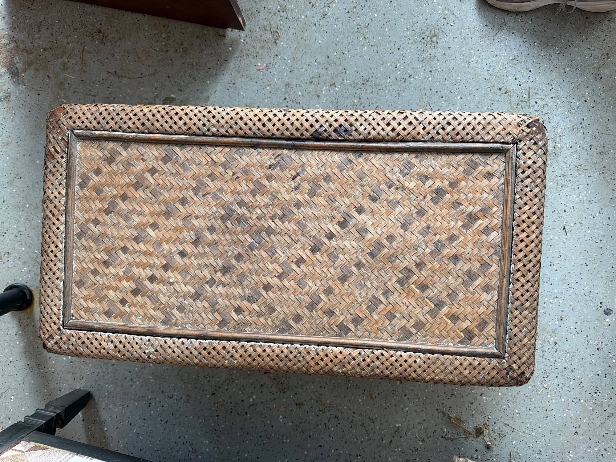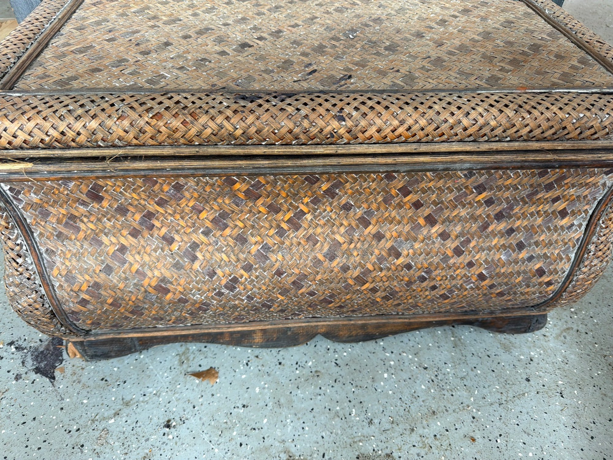 Rectangular trunk featuring a woven rattan design on all sides and top, framed with wooden edging. The trunk includes a hinged lid that opens to reveal a spacious wood-lined interior. Visible wear consistent with use is present. Suitable for storage or decorative purposes. Dimensions: approximately 30 inches (length) x 15 inches (width) x 16 inches (height).