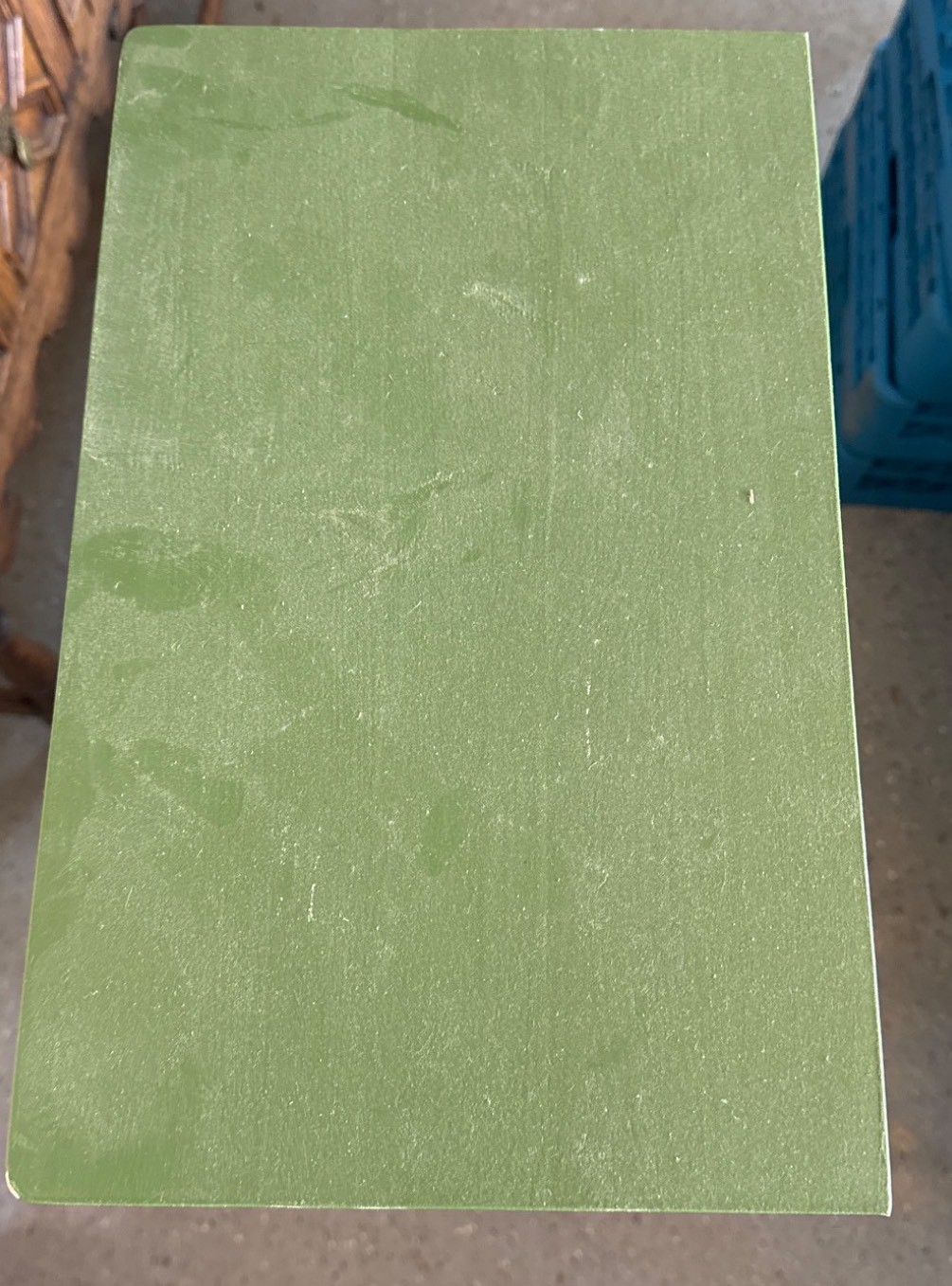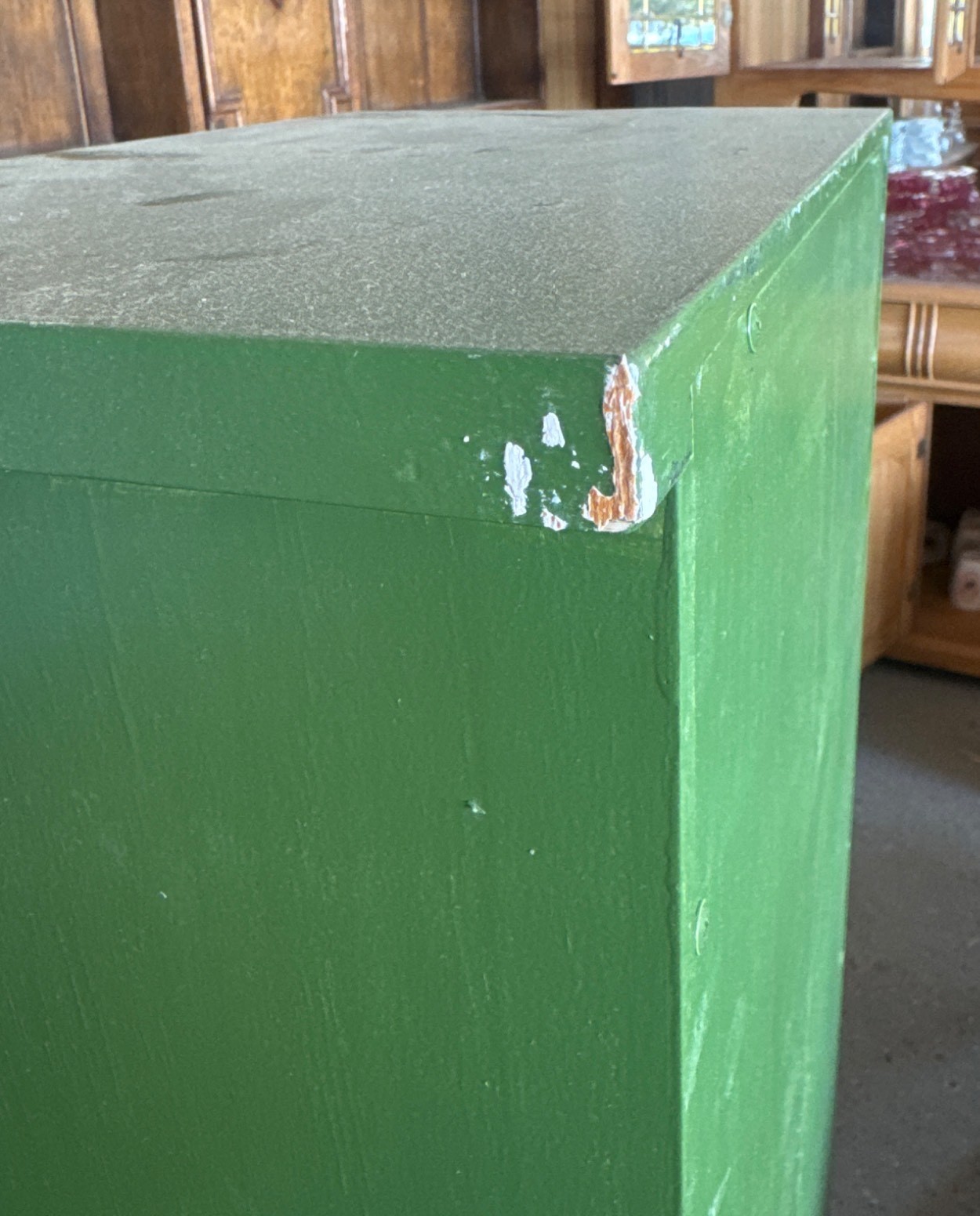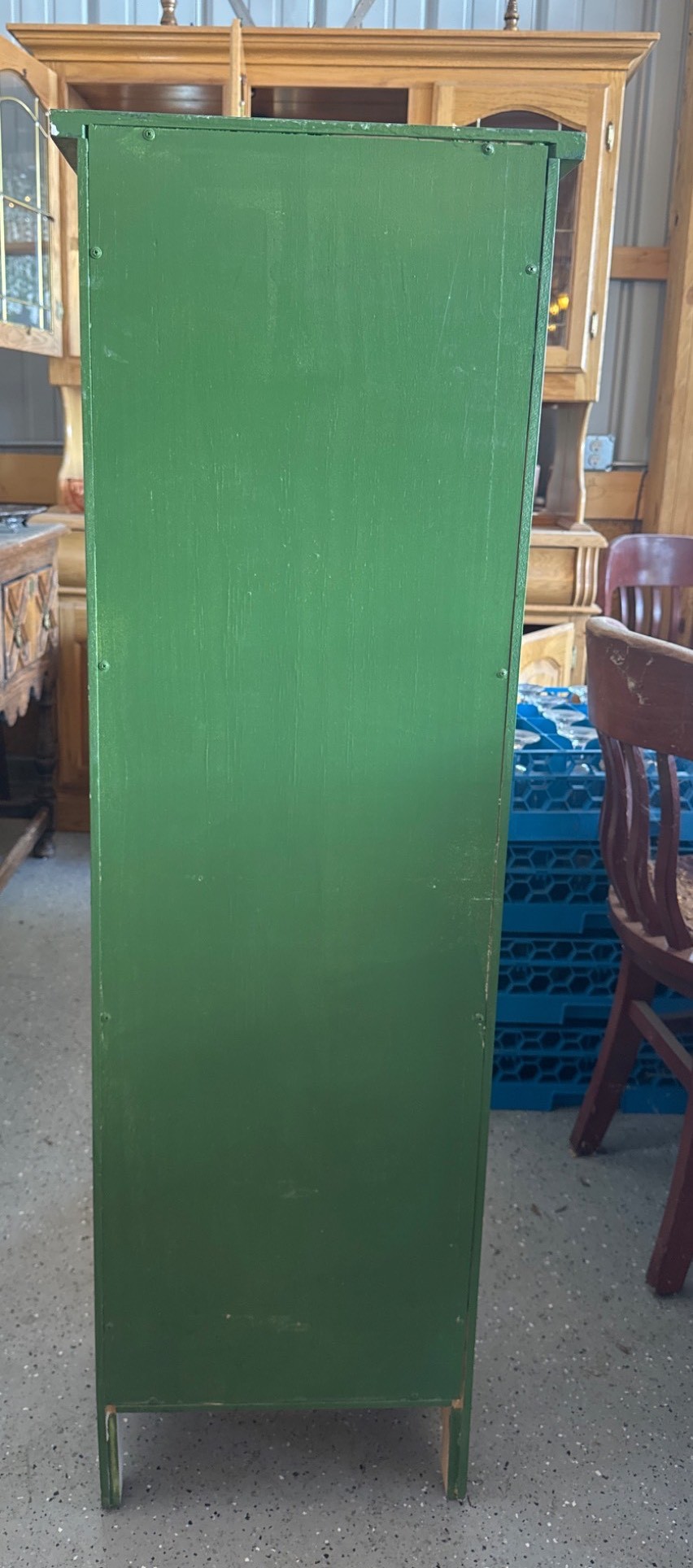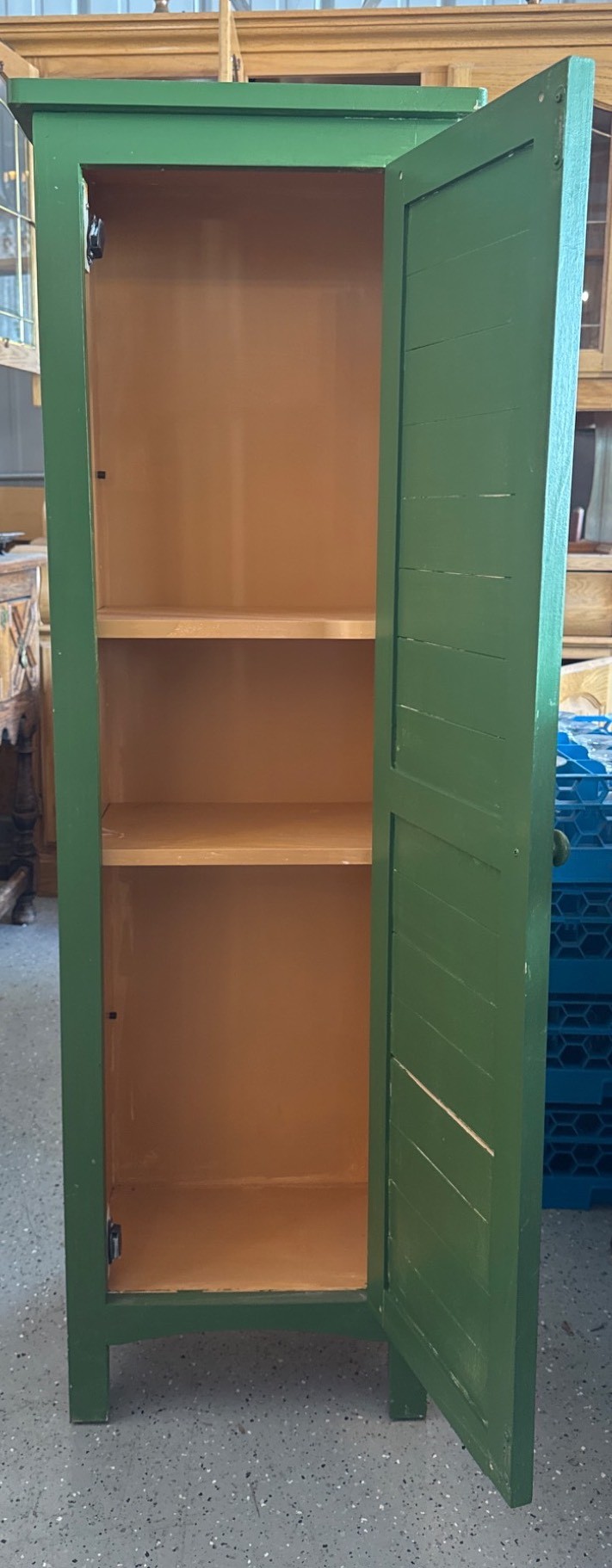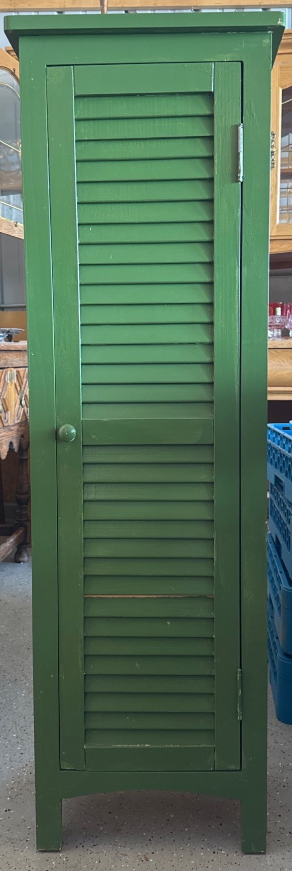 Single-door wooden cabinet painted green, featuring a louvered design on the front door and two interior shelves. The interior is painted a contrasting tan color. Moderate wear is visible on the exterior, including small chips and scratches to the paint, primarily on the edges. Dimensions: Approximately 48 in. high x 16 in. wide x 12 in. deep.