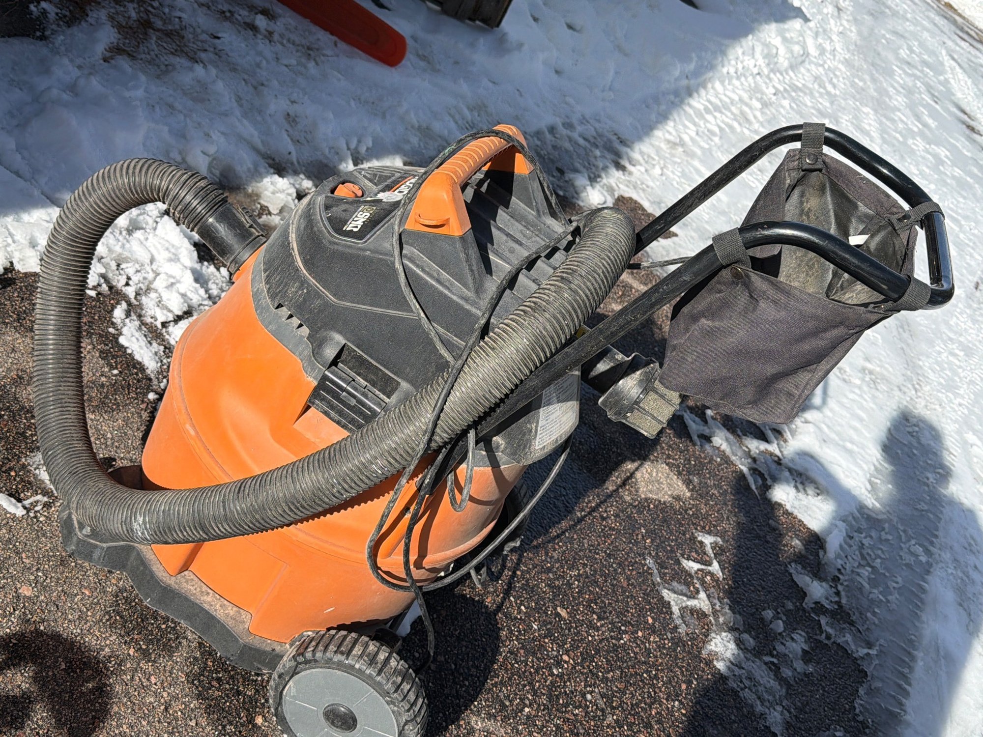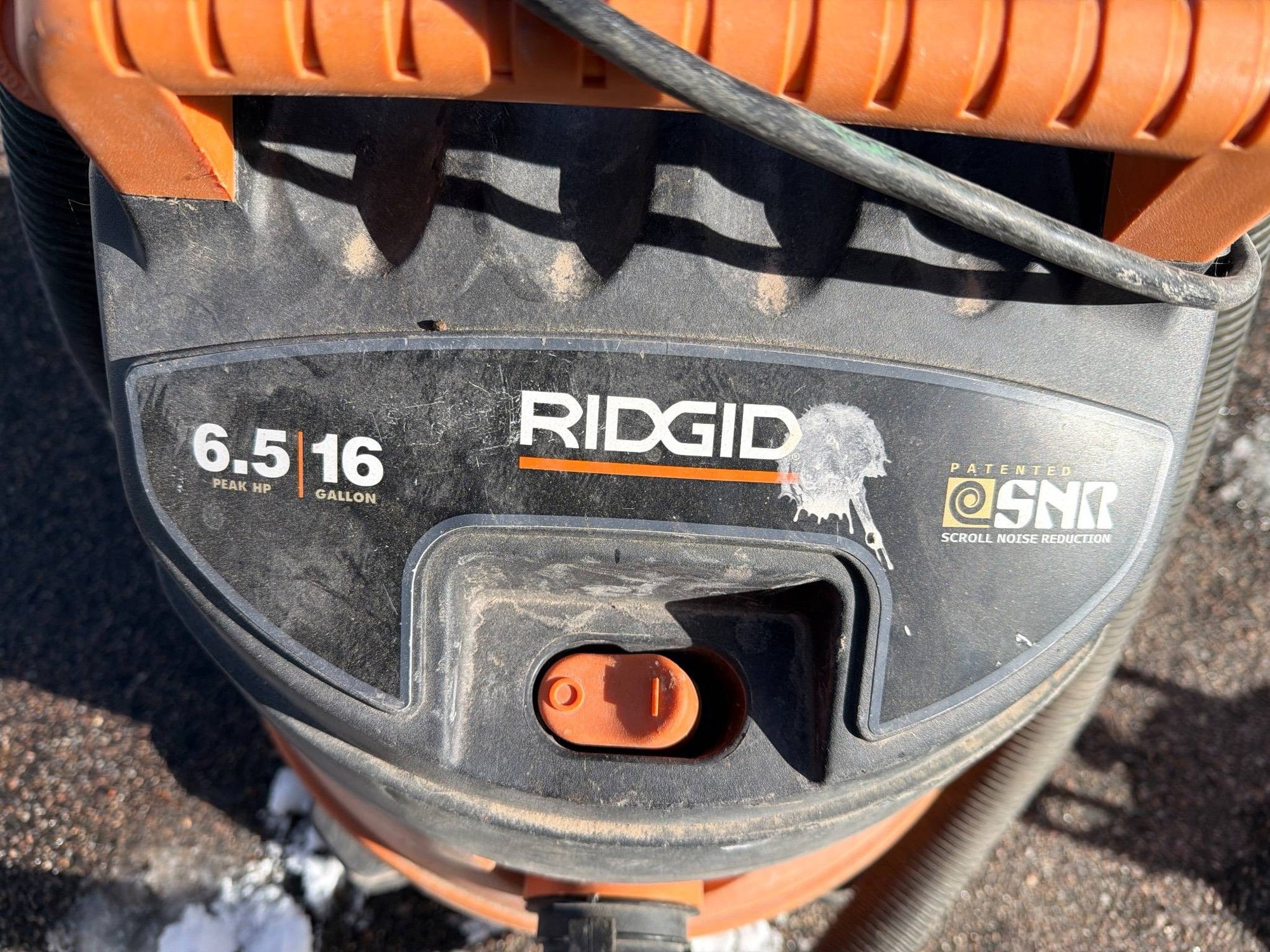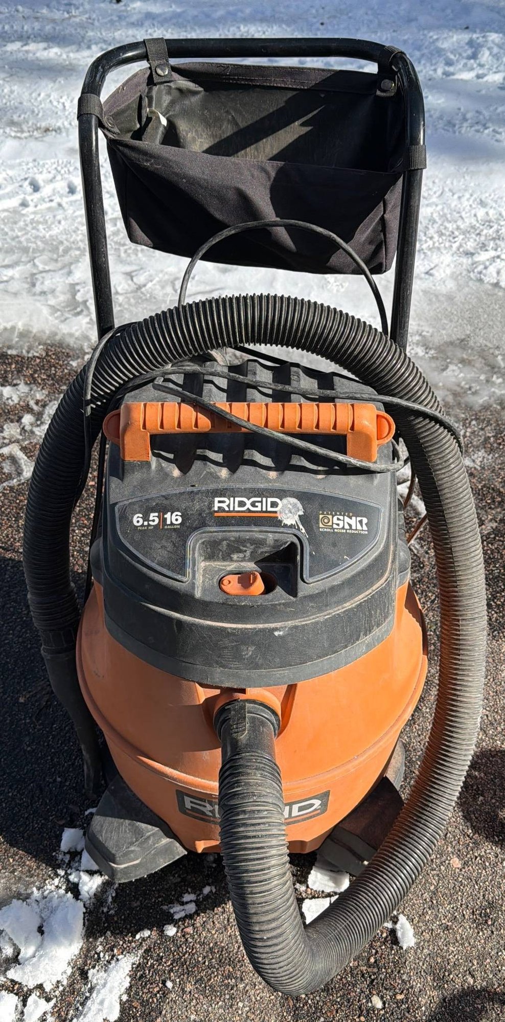 RIDGID 6.5 horsepower wet/dry vacuum model 16 Gallon (6.5/16) with an attached hose and cord. Features include a durable orange and black plastic construction, integrated carrying handle, and rear utility basket for additional storage. Unit sits on casters for mobility. Exhibits minor wear consistent with use. Approximate dimensions: 34 inches tall, 20 inches wide, including hose attachment.