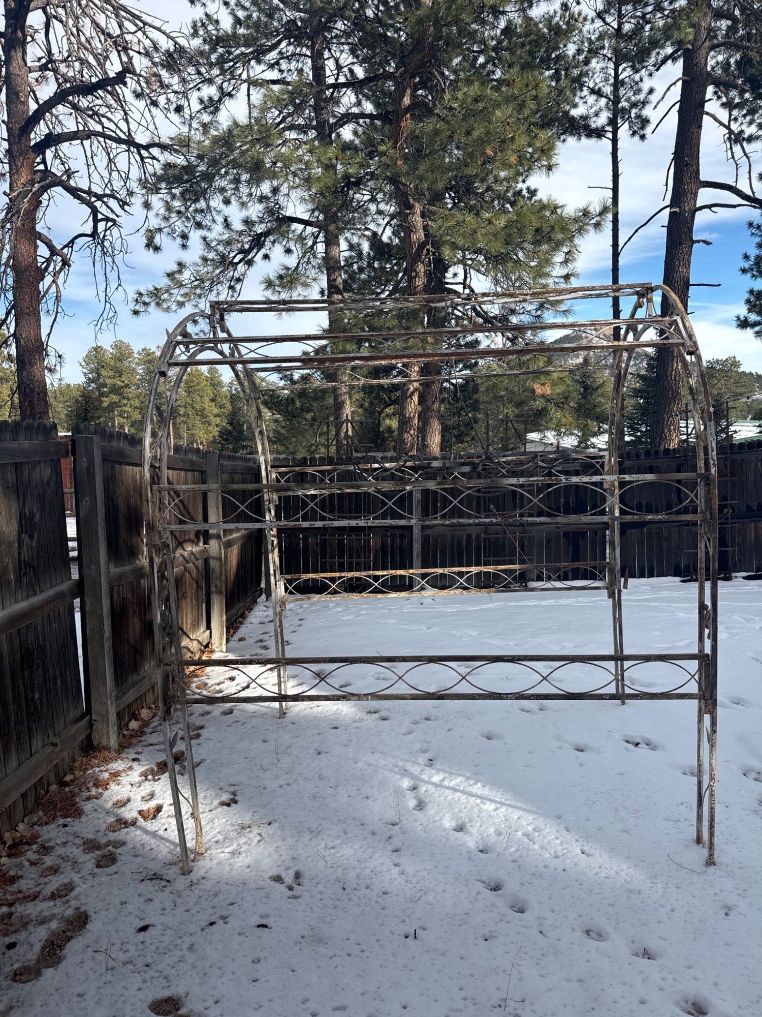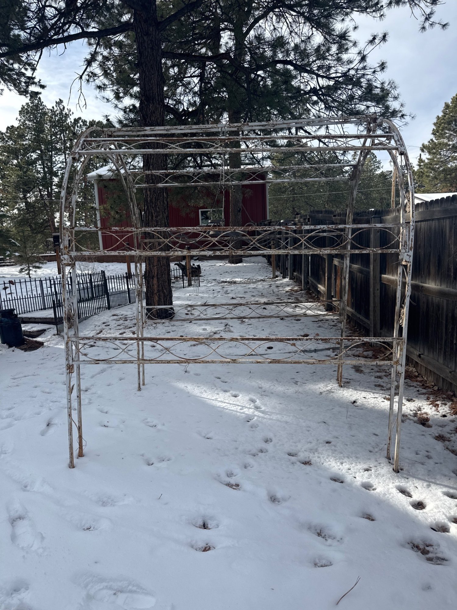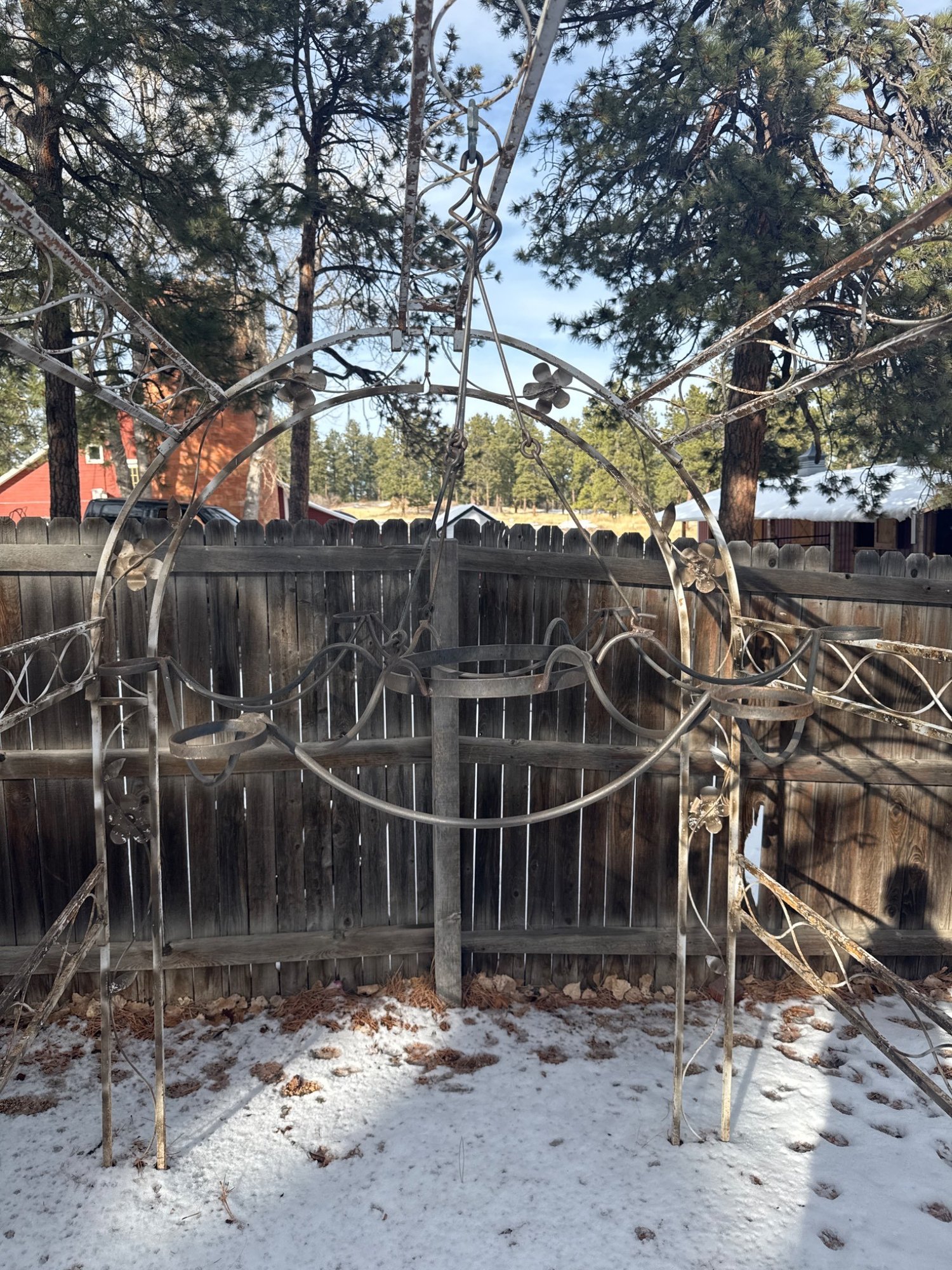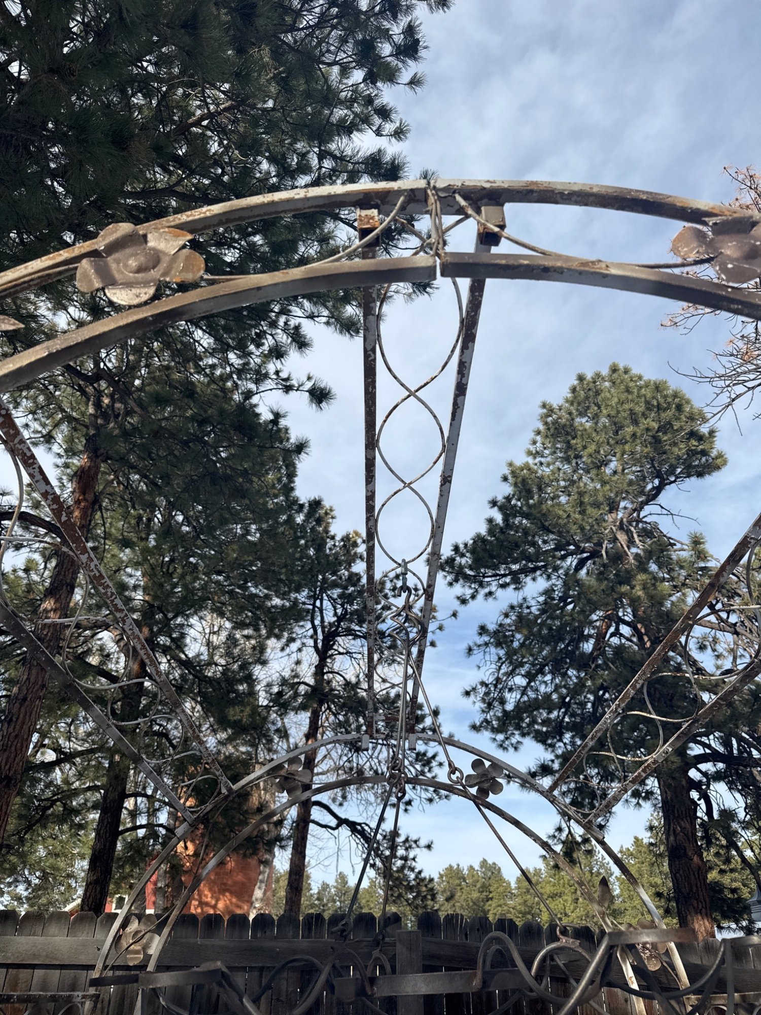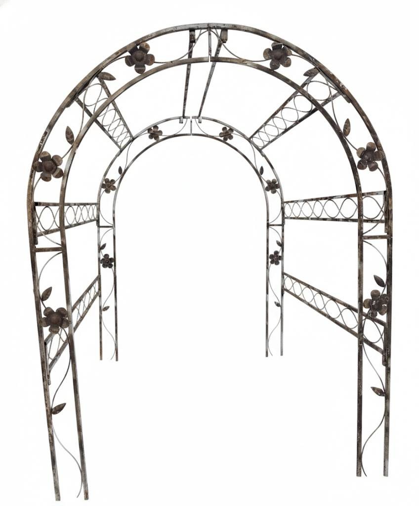 Metal garden arch trellis constructed with curved and vertical framework featuring floral and vine detailing. Designed with decorative roses and leaf accents. Likely used for supporting climbing plants or as a decorative garden feature. Exhibits weathering and rust consistent with outdoor exposure. Measures approximately 8 ft. tall, 5 ft. wide, and 2 ft. deep.