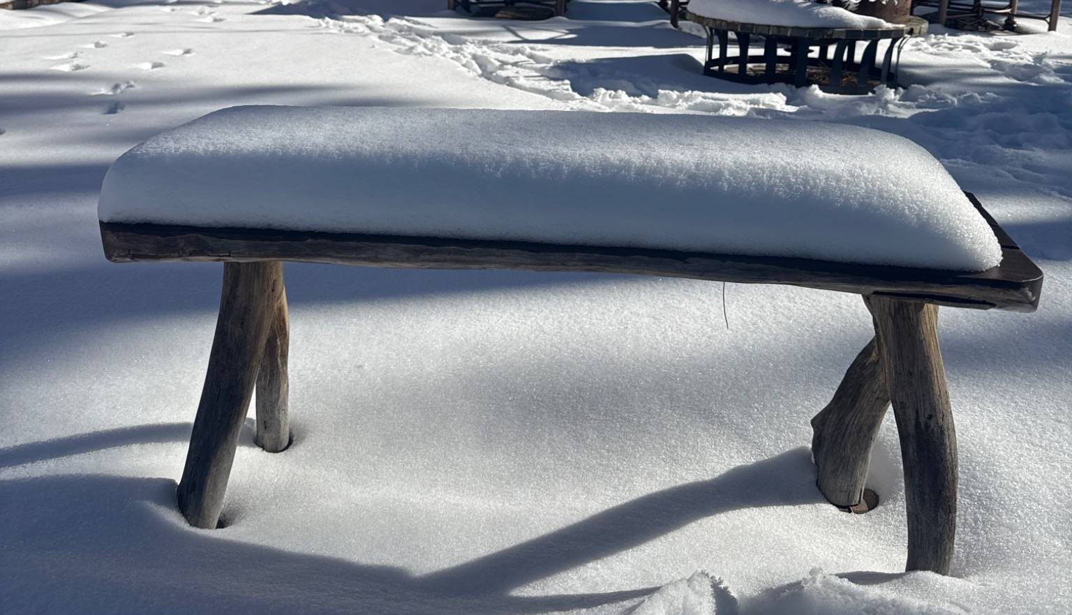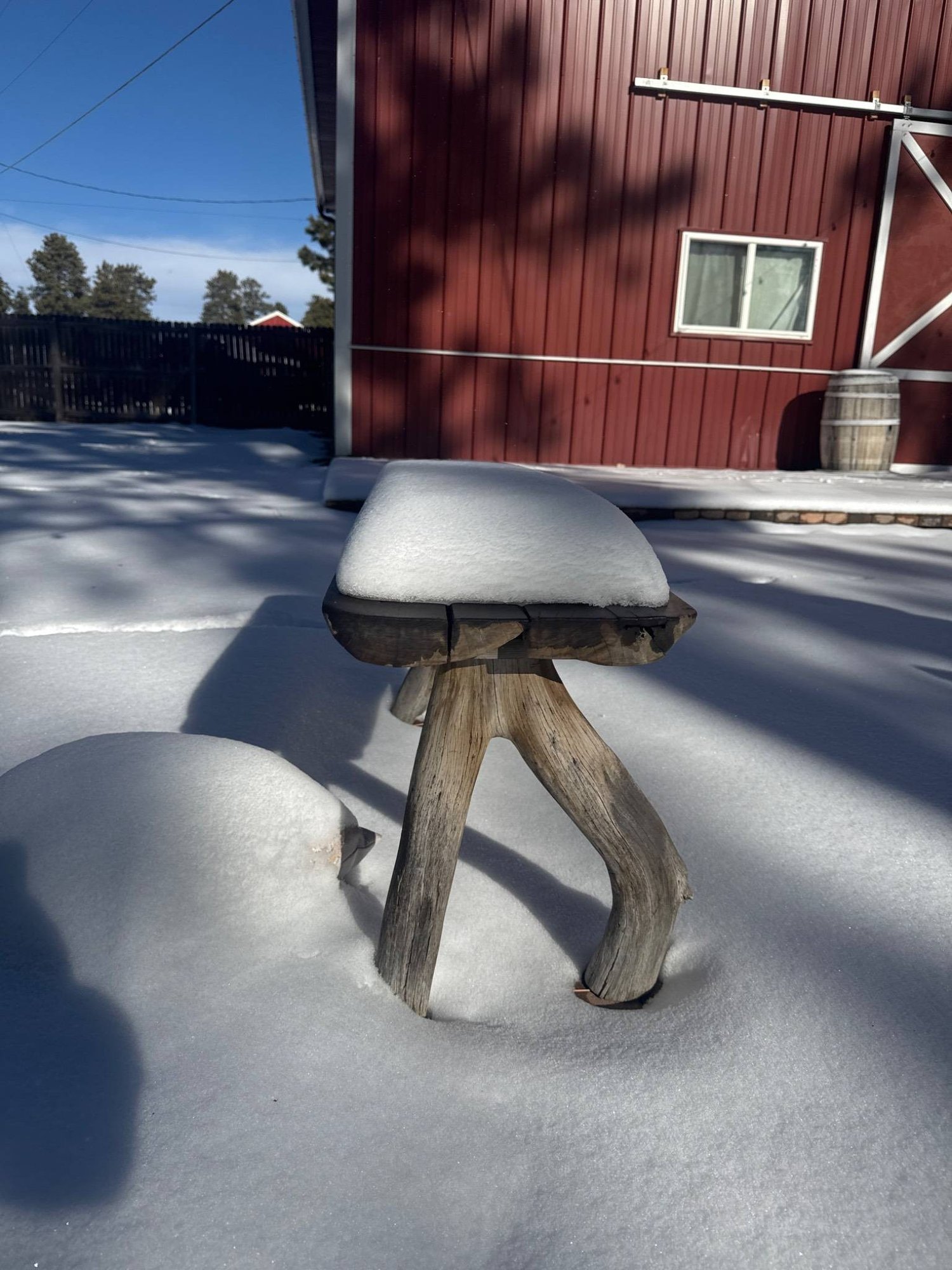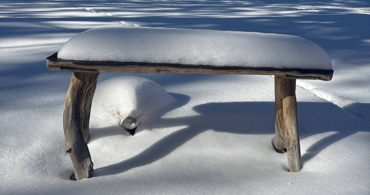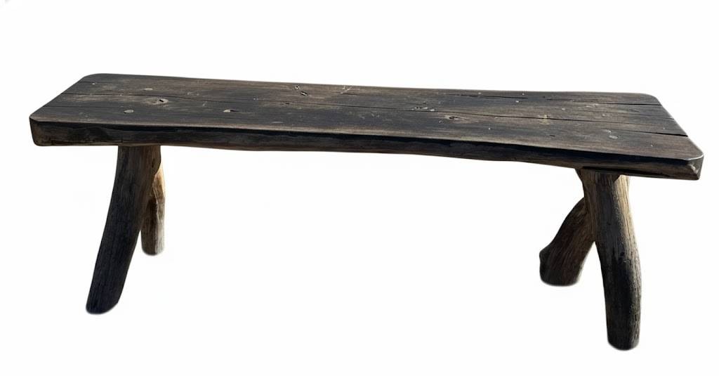 Rustic bench featuring a flat wooden seat supported by three natural, unprocessed branch-like wooden legs. The minimalist design highlights the organic form of the wood. Suitable for outdoor or indoor use. Dimensions: 18 inches high, 40 inches long.