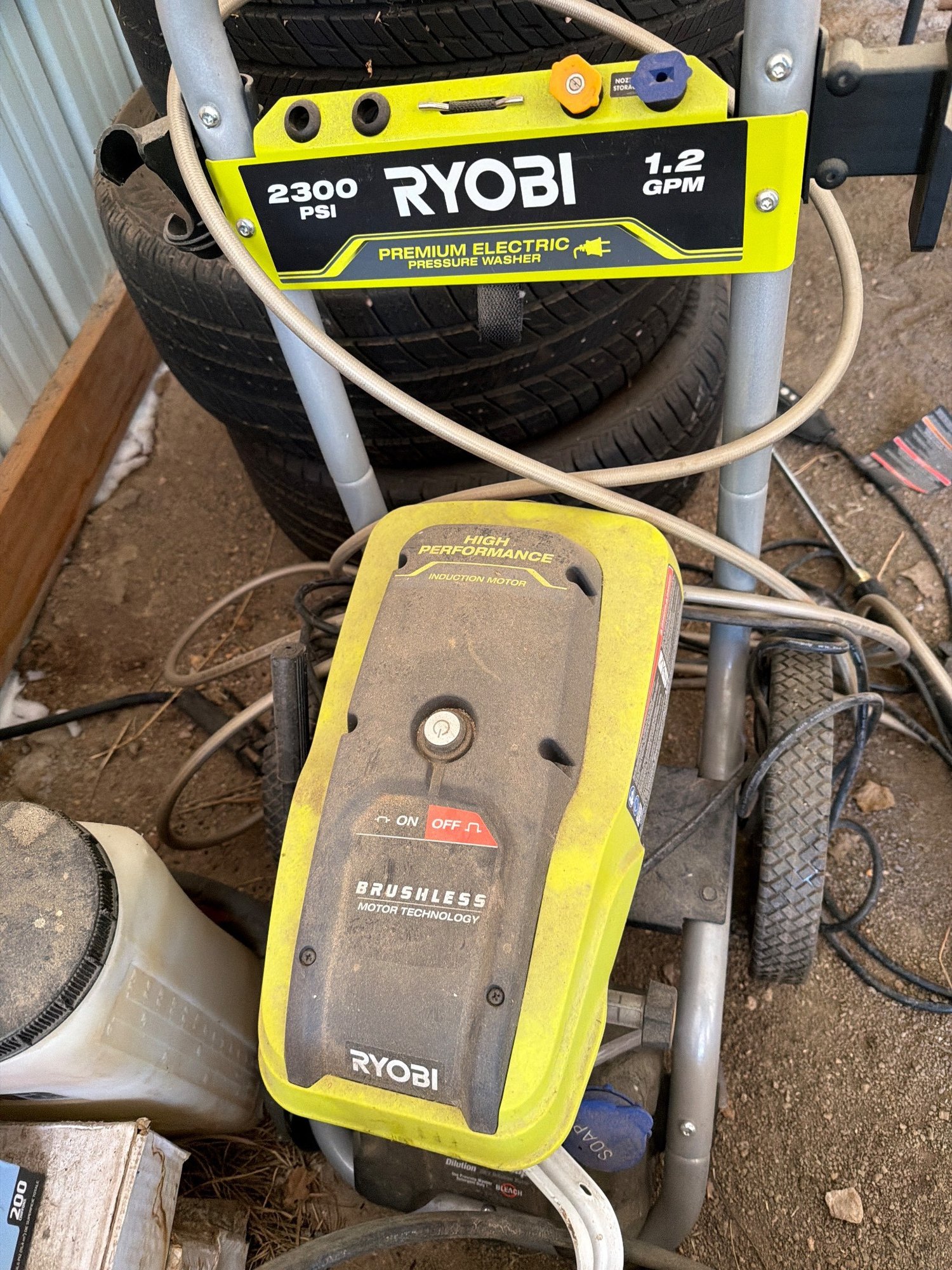 Ryobi 2300 PSI 1.2 GPM brushless electric pressure washer, featuring a durable frame with wheels for portability, an integrated hose, and adjustable handle. Equipped with a brushless motor for increased efficiency and performance. Includes detergent tank attachment. Dimensions: approximately 20 in (L) x 18 in (W) x 35 in (H).