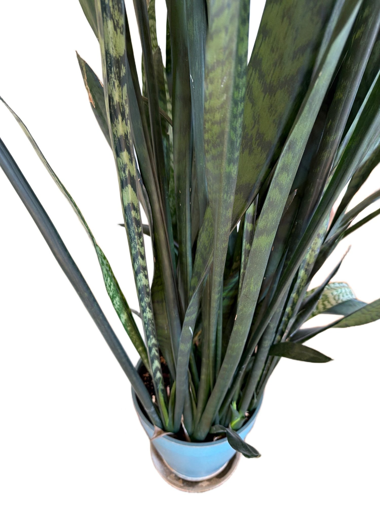 Tall Sansevieria Trifasciata (Snake Plant) housed in a blue pot. Plant measures over 68 inches in height (approx. 5 feet 8 inches) including pot. Features upright, sword-like leaves with green variegation. Pot dimensions and material are unspecified. Condition appears healthy with no major damage noted.
