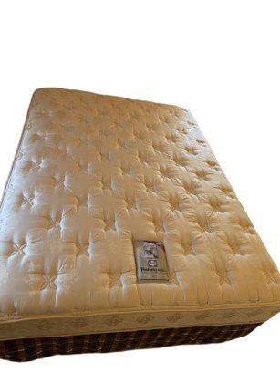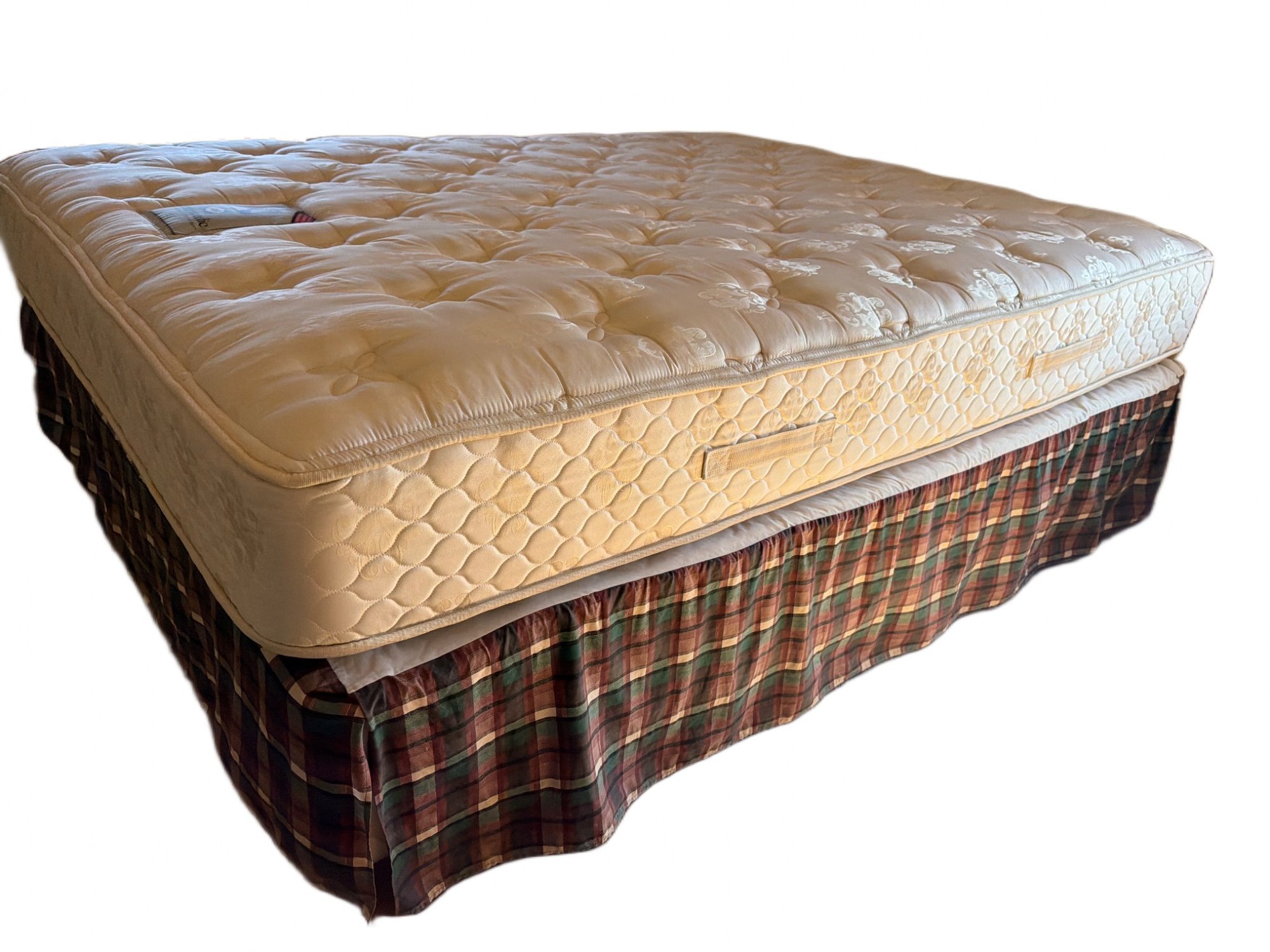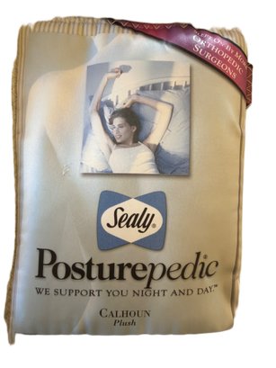 Sealy Posturepedic Calhoun Plush mattress with an approximate thickness of 12 inches. The lot includes the matching box spring. This mattress model is designed to provide orthopedic support, as endorsed by orthopedic surgeons. Both mattress and box spring appear to be in good physical condition with light signs of prior use. Mattress is clean