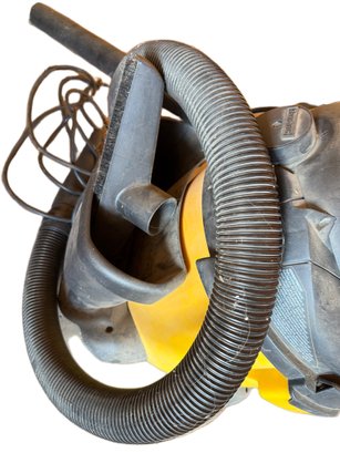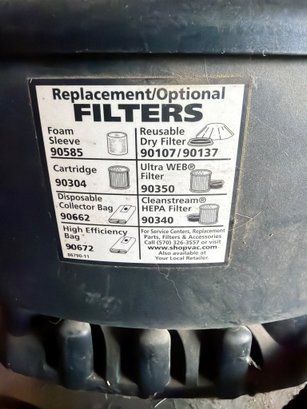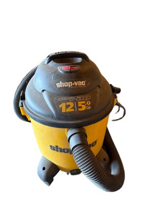 Shop-Vac wet/dry vacuum with a 12-gallon capacity and a 5.0 peak horsepower motor. The model supports reusable dry filters (90107/90137) and optional high efficiency, cartridge, or HEPA filters. Appears operational with visible usage signs. Includes attached hose and power cord, though no additional accessories are shown.