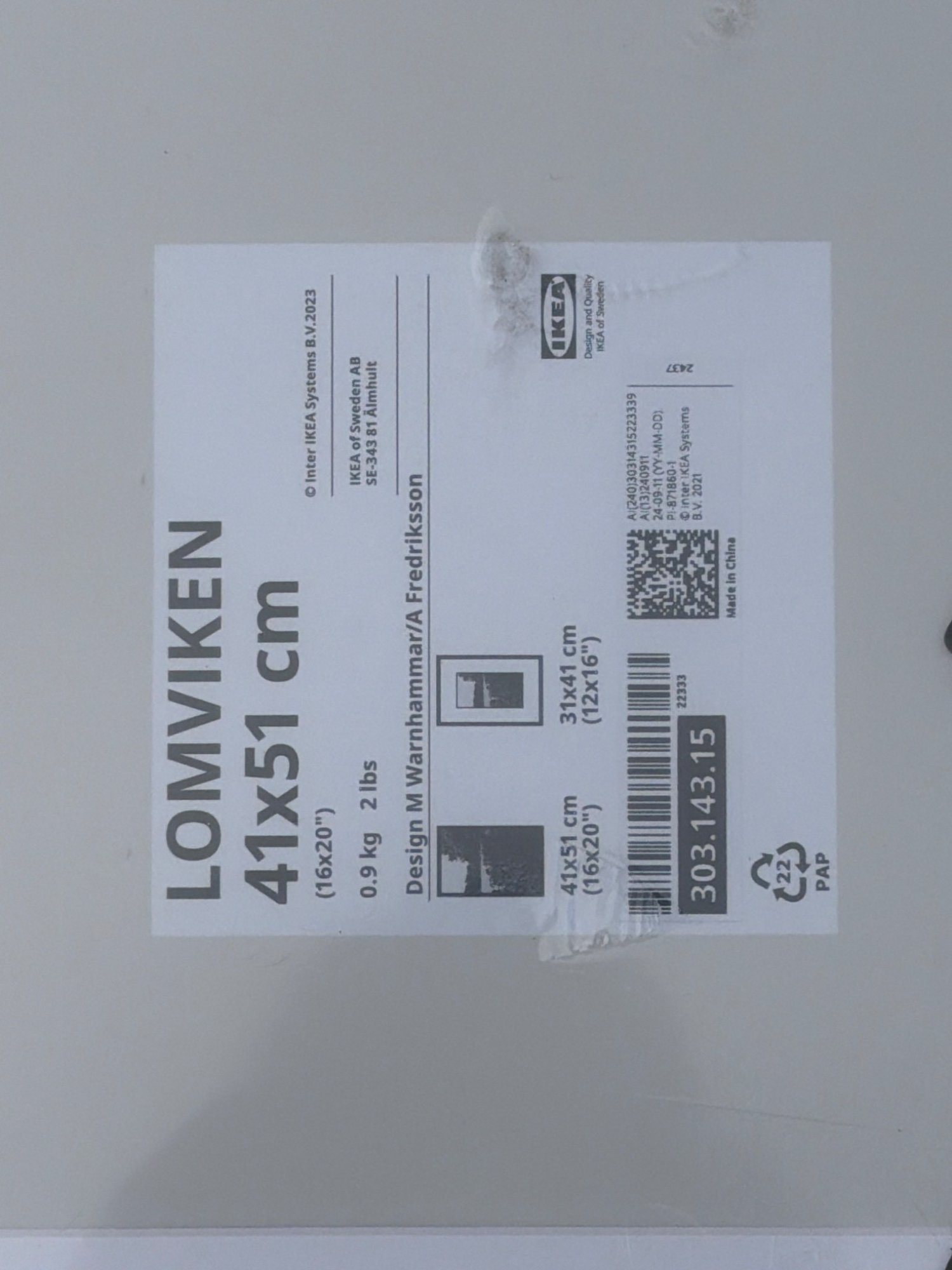Six picture frames, including two IKEA models: LOMVIKEN (41x51 cm) and FISKBO (16x20 inches). Also featured is a Green Tree Gallery frame with a 16x20-inch photo opening, made in China. Measurements for LOMVIKEN noted as 41x51 cm and FISKBO as 16x20 inches.