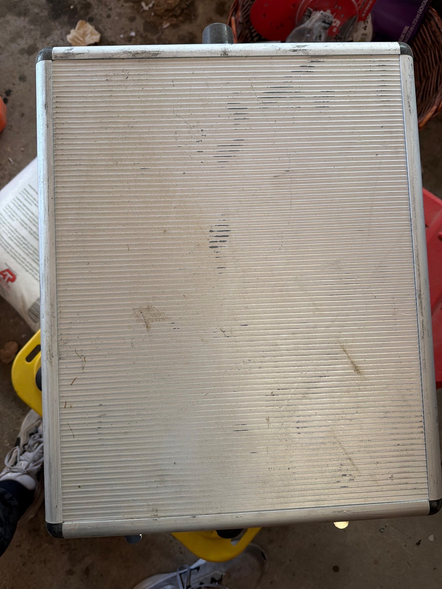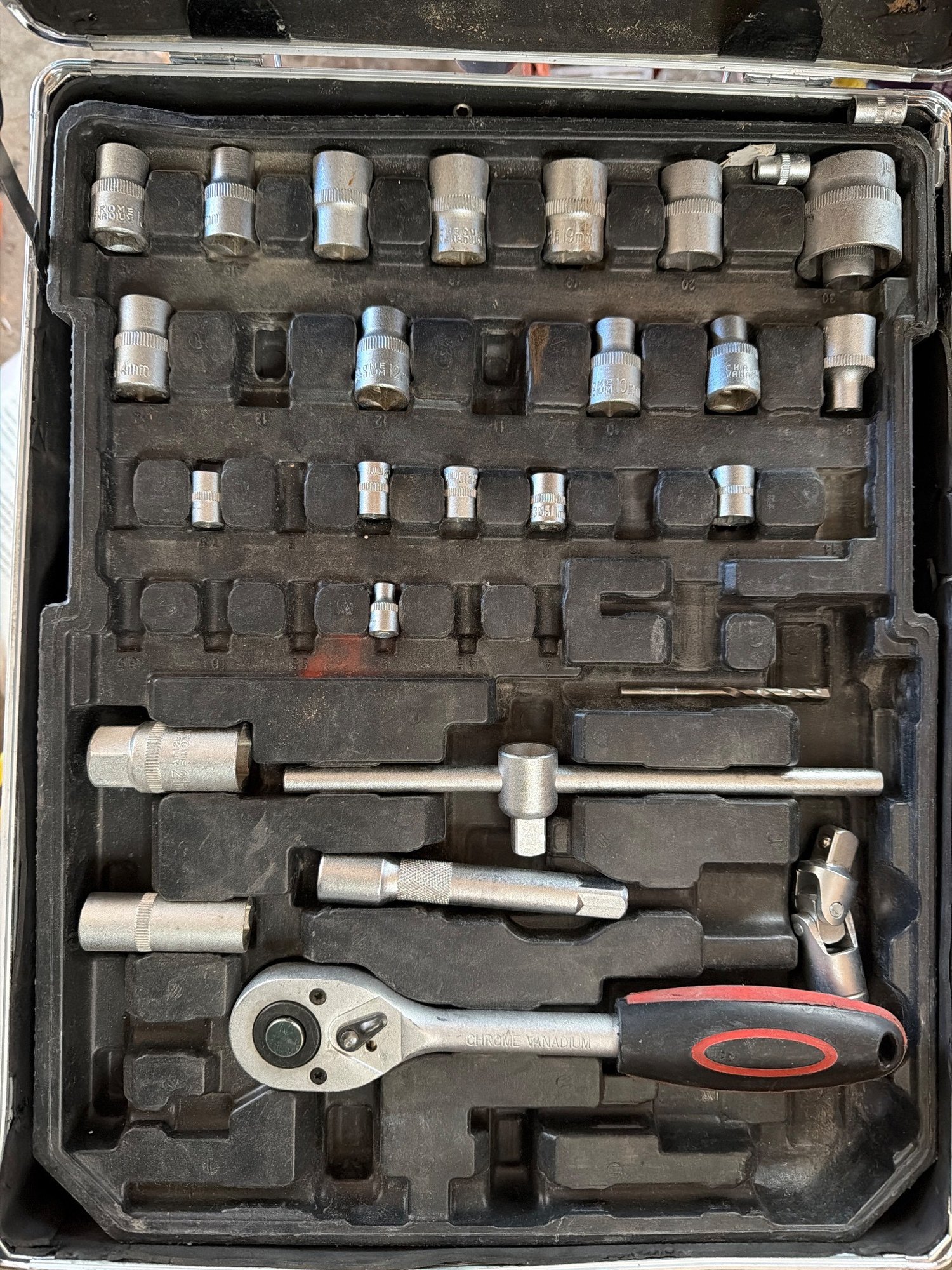 Socket wrench set featuring a ratcheting handle, multiple socket attachments of various sizes, and extension pieces. Includes an aluminum carrying case with a textured exterior for portability and secure storage. Surface wear evident on the case and tools consistent with prior usage. Dimensions of the case: approximately 14 x 12 x 3 inches.