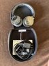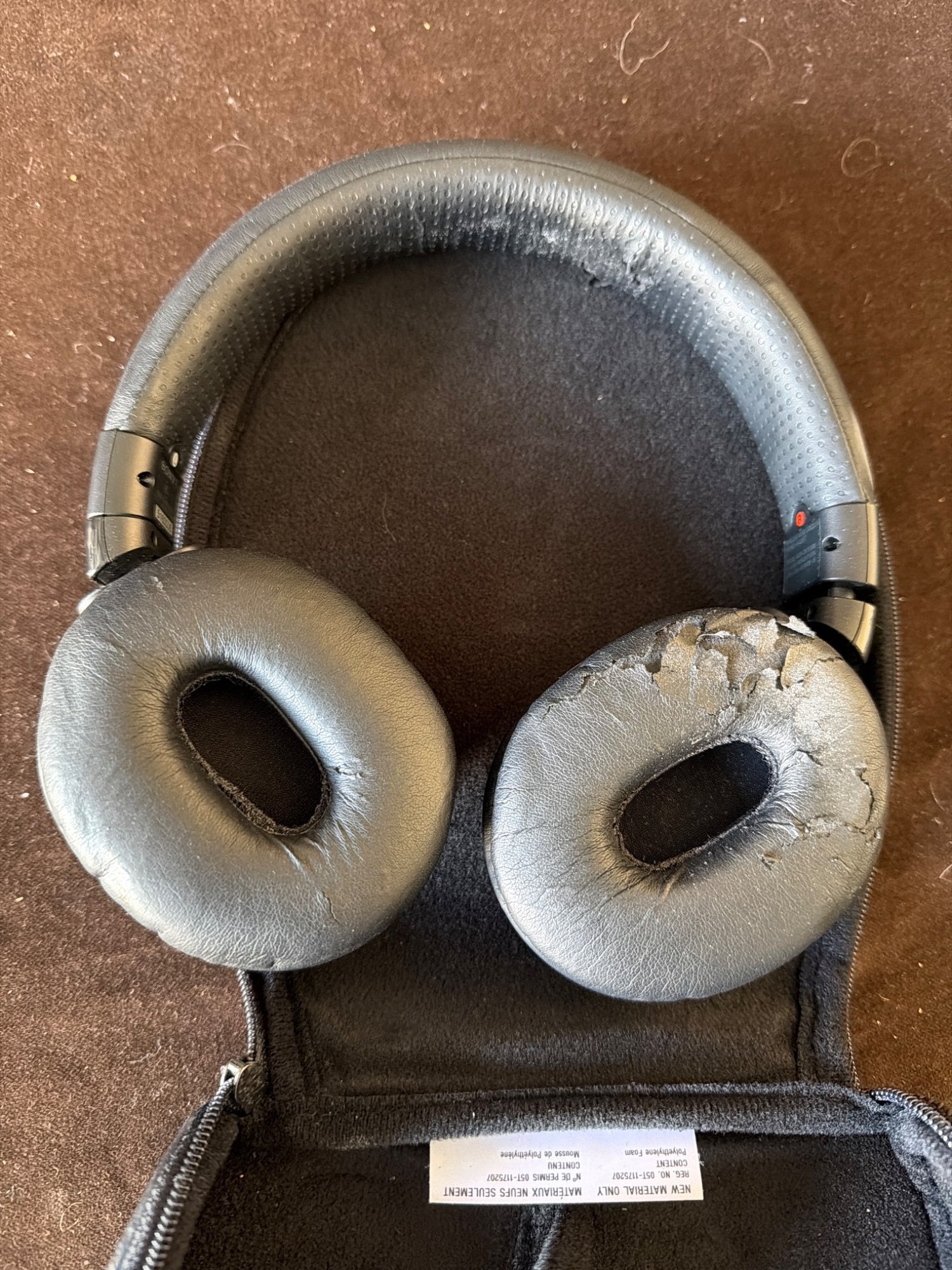 Sony noise-canceling over-ear headphones with swiveling ear cups and adjustable headband. The lot includes the hard-shell carrying case, power adapter, and a charging cable. The ear pads show notable wear and some surface damage. The item appears functional but has visible signs of use. Model or serial information is not specified.