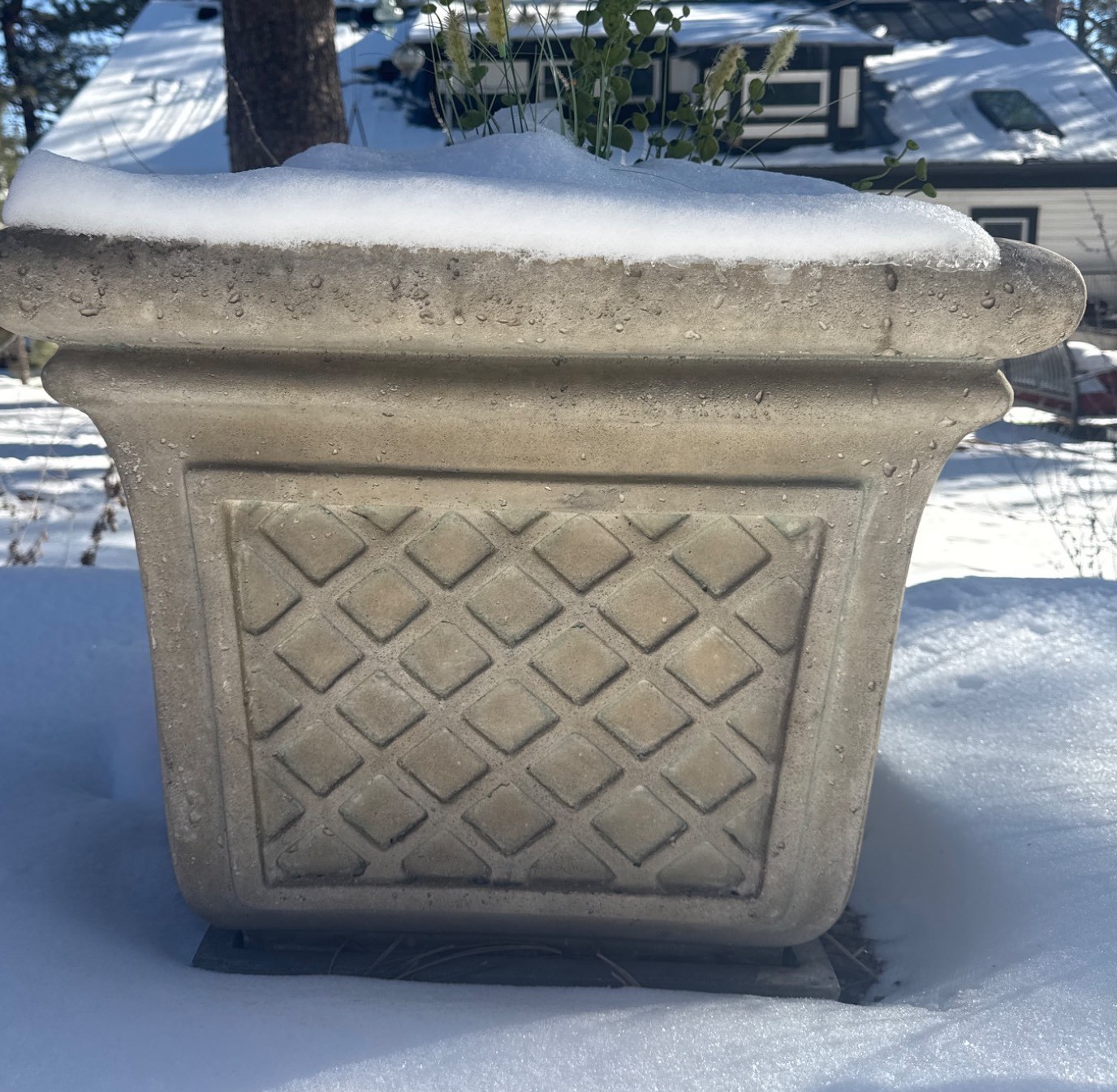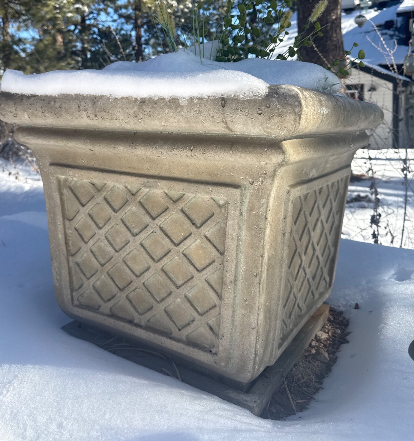 Square concrete planter featuring a detailed diamond relief pattern on all sides. Constructed from solid concrete, the planter is suitable for outdoor use and displays moderate signs of weather exposure. Approximate dimensions: 21 in high, 24×24 in top width.