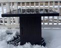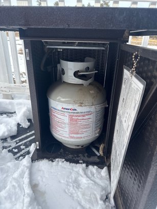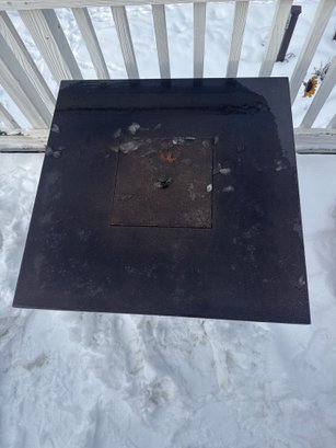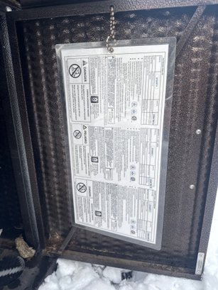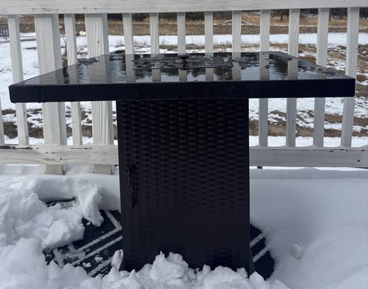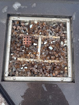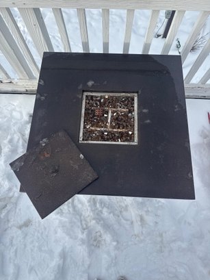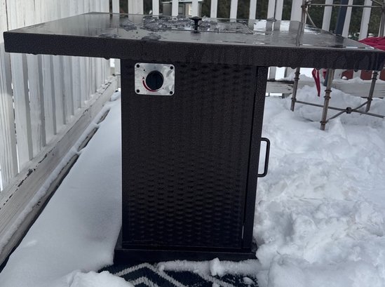Square propane-powered fire pit table featuring a textured dark brown metal base and top. Includes a central firebox with glass rocks, a removable top cover, and a concealed compartment for a propane tank. Designed for outdoor use. Dimensions: Approx. 34 in. W x 34 in. D x 29 in. H.
