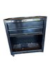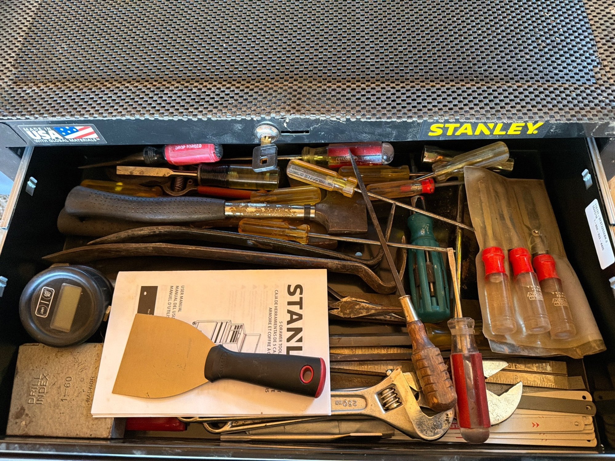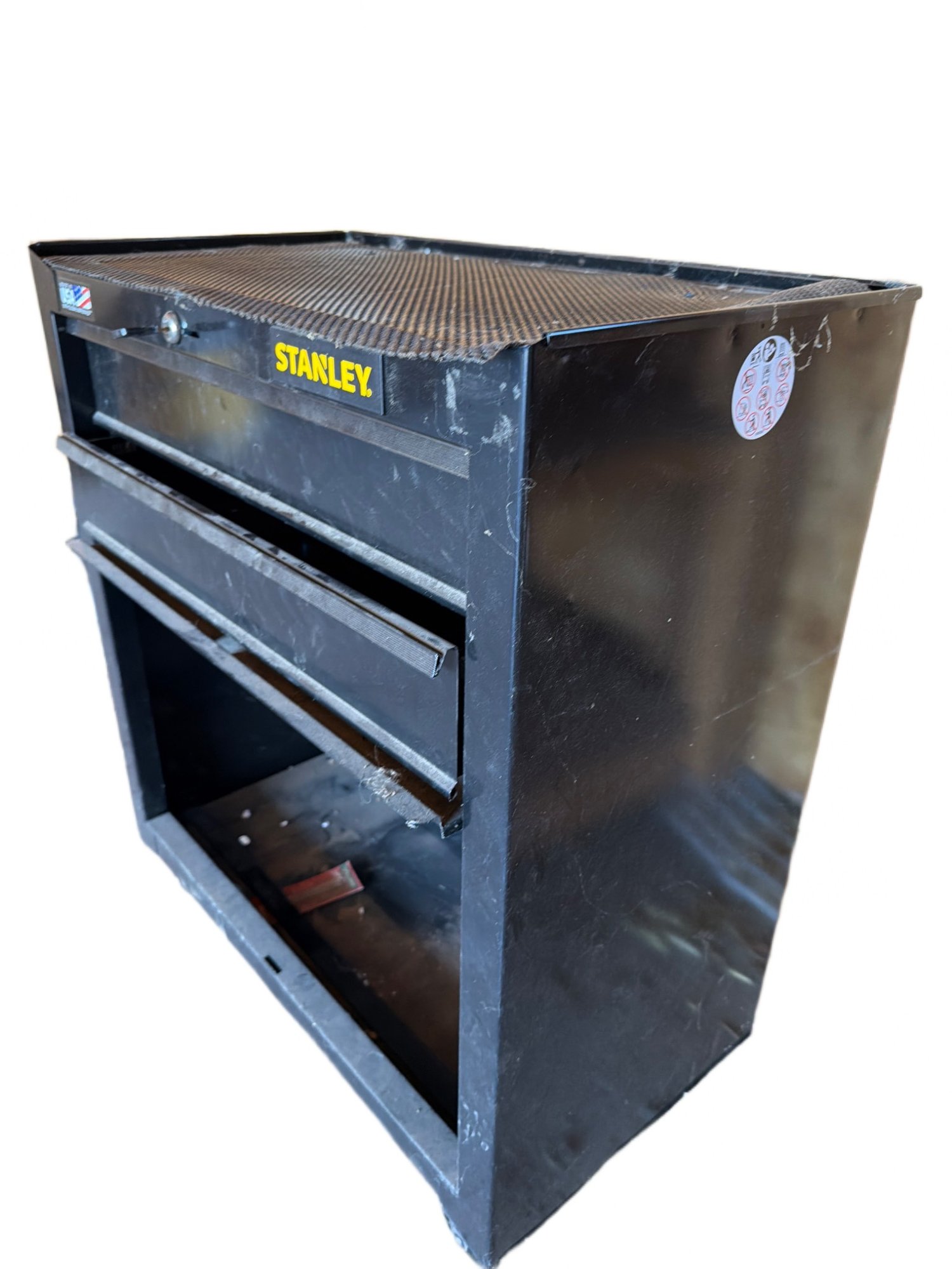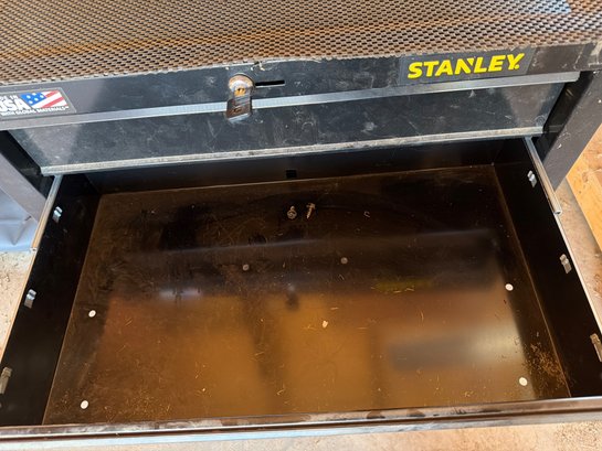 This listing is for a Stanley tool cart featuring two drawers with an empty lower storage compartment and mounted on four caster wheels for mobility. The cart includes a lockable top drawer for secure storage. Accessories in the drawers, such as hand tools, are visible but not part of the listing unless otherwise specified. The condition is used and shows signs of wear consistent with utility. Dimensions or model number markings are not visible from the images.