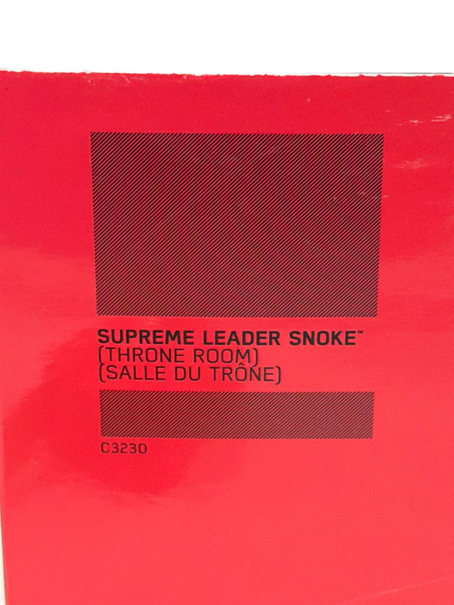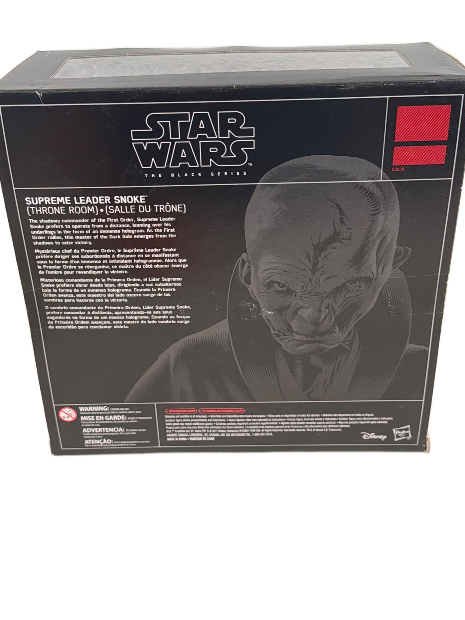 Star Wars The Black Series Supreme Leader Snoke (Throne Room) action figure set by Hasbro, featuring a detailed figure and throne accessory. The packaging dimensions are approximately 10 inches high, as shown in the photographs. The figure showcases Snoke in a gold robe with detailed facial sculpting. Box is unopened; condition consistent with storage and handling.