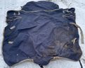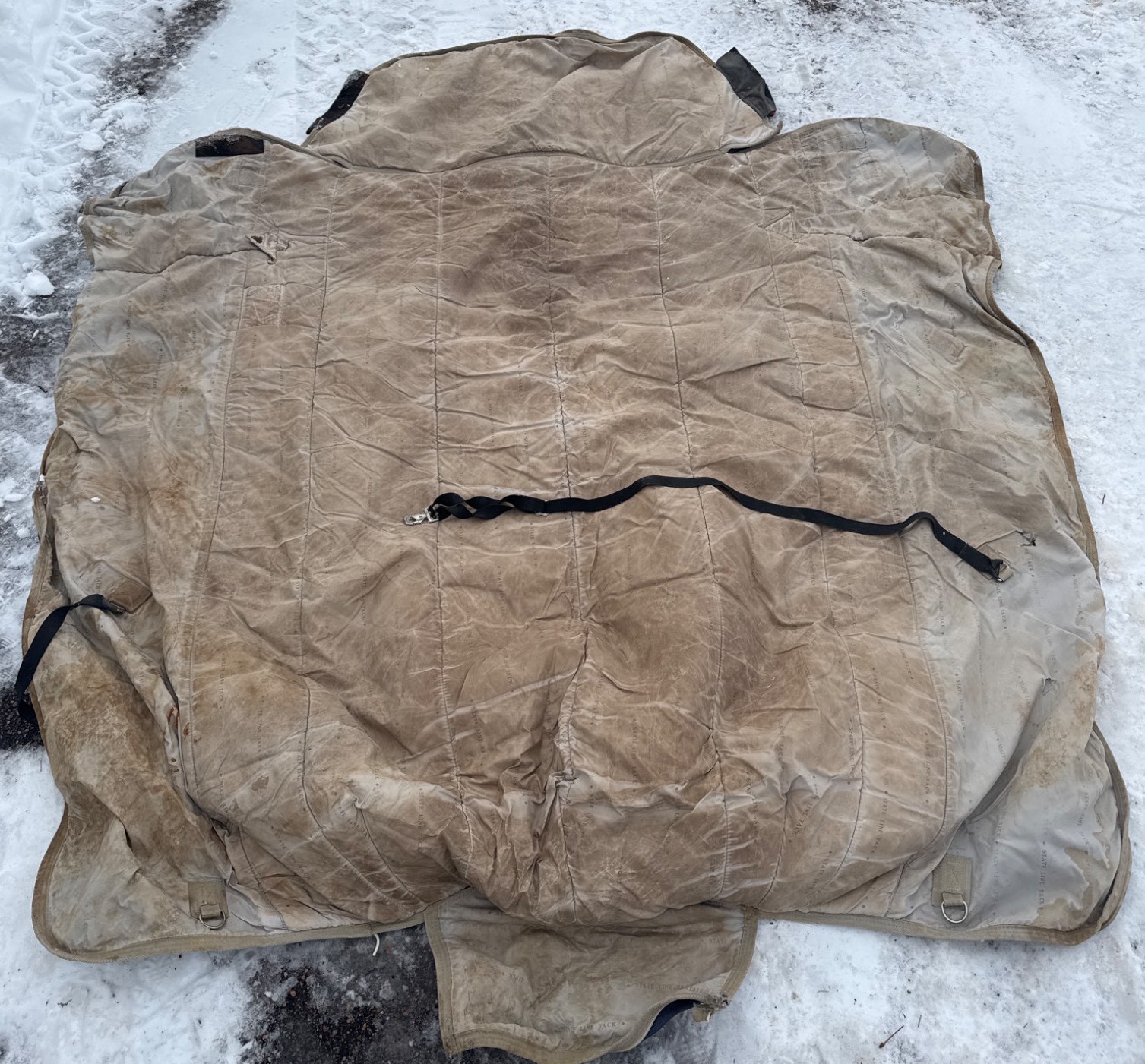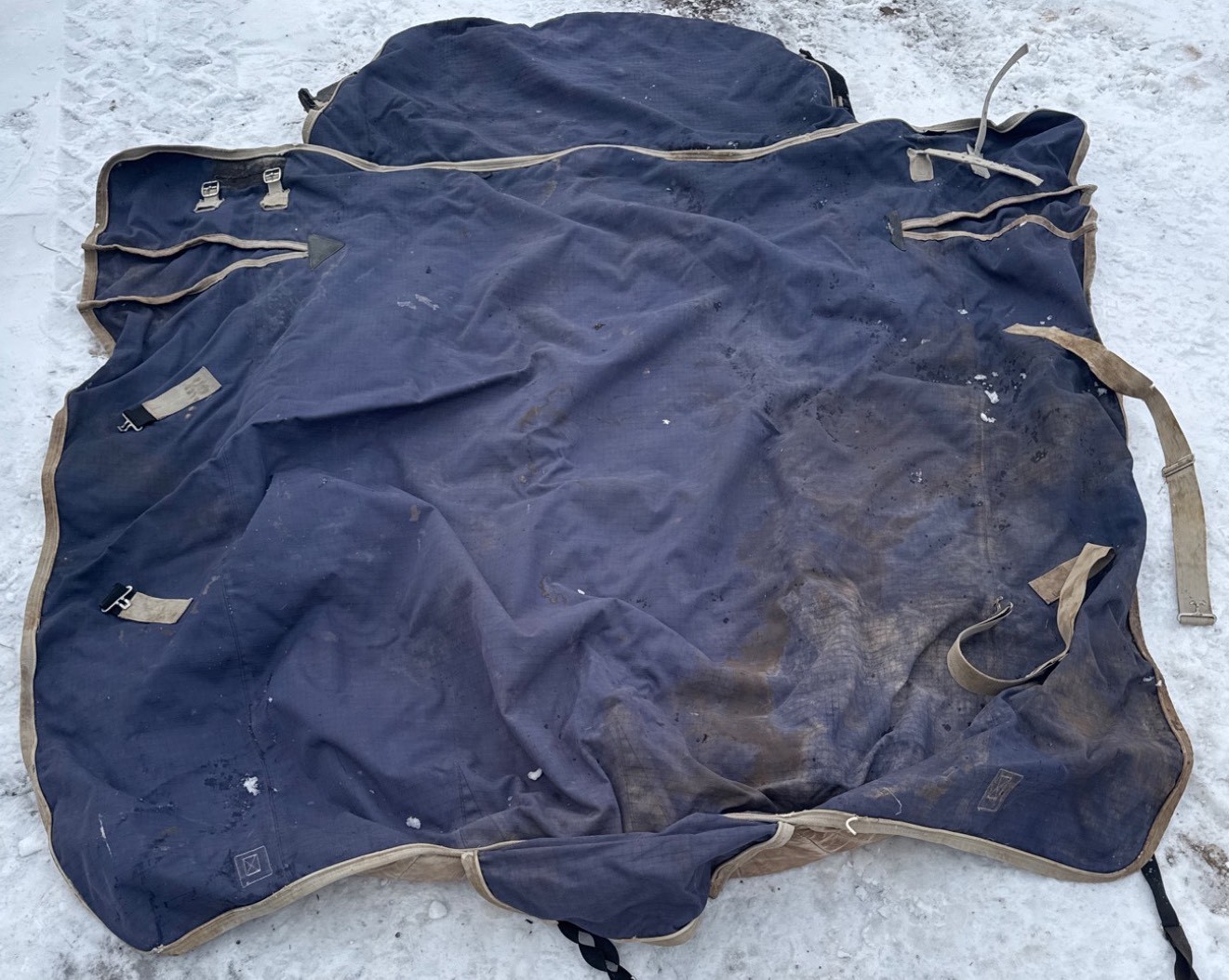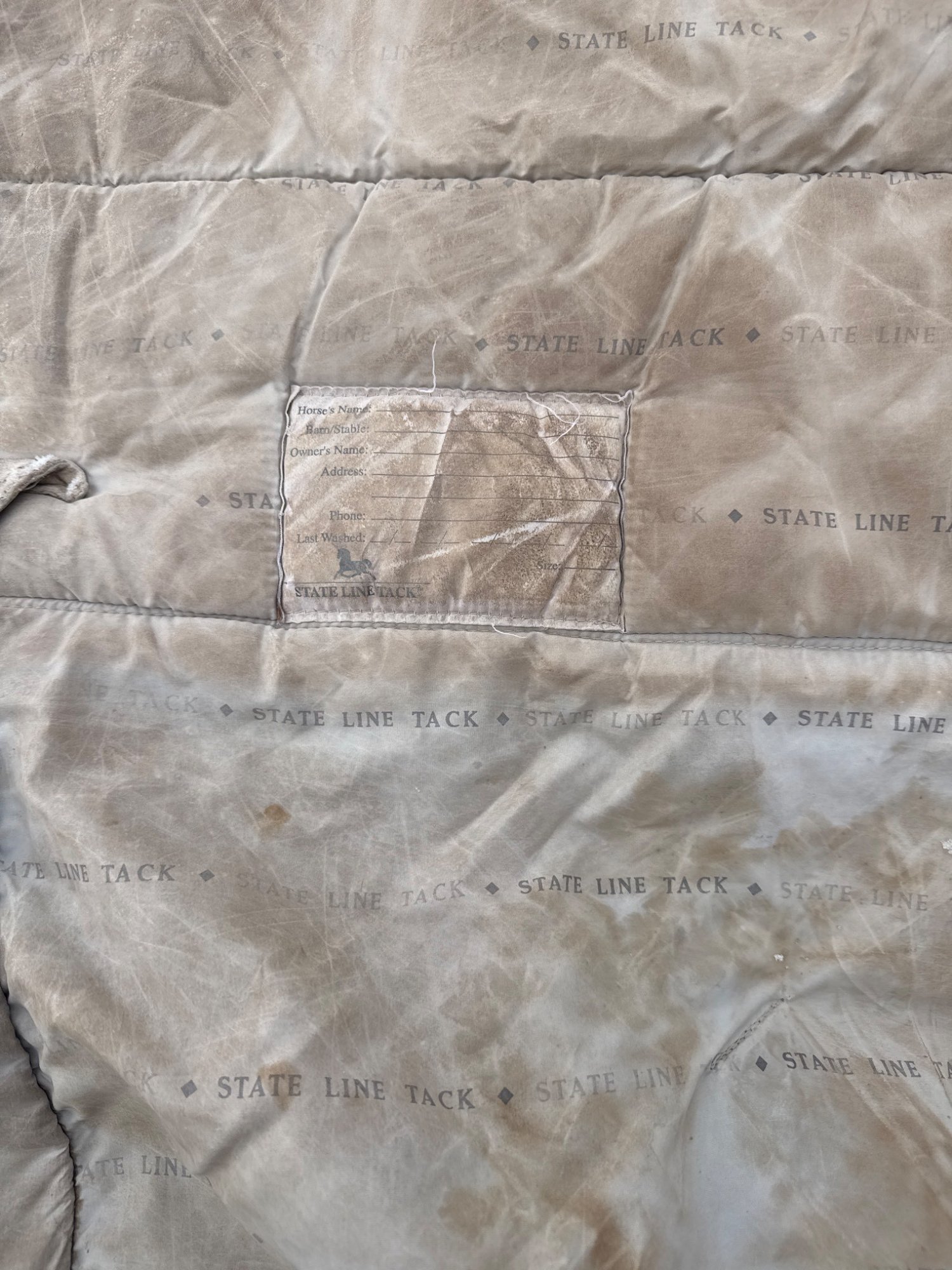 State Line Tack horse blanket featuring a dual-sided design with a navy exterior and tan interior. Includes adjustable straps, buckles, and reinforced edges for secure fitting. The interior shows a printed ‘State Line Tack’ logo pattern. Exhibits wear and stains indicative of use. Suitable for equine outdoor coverage.