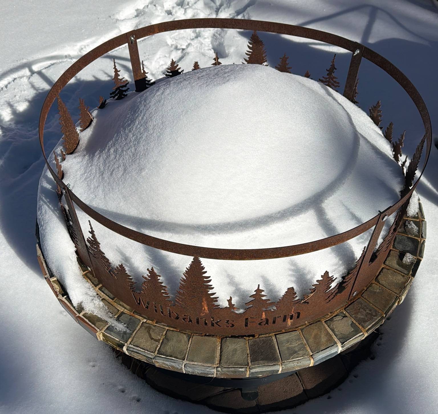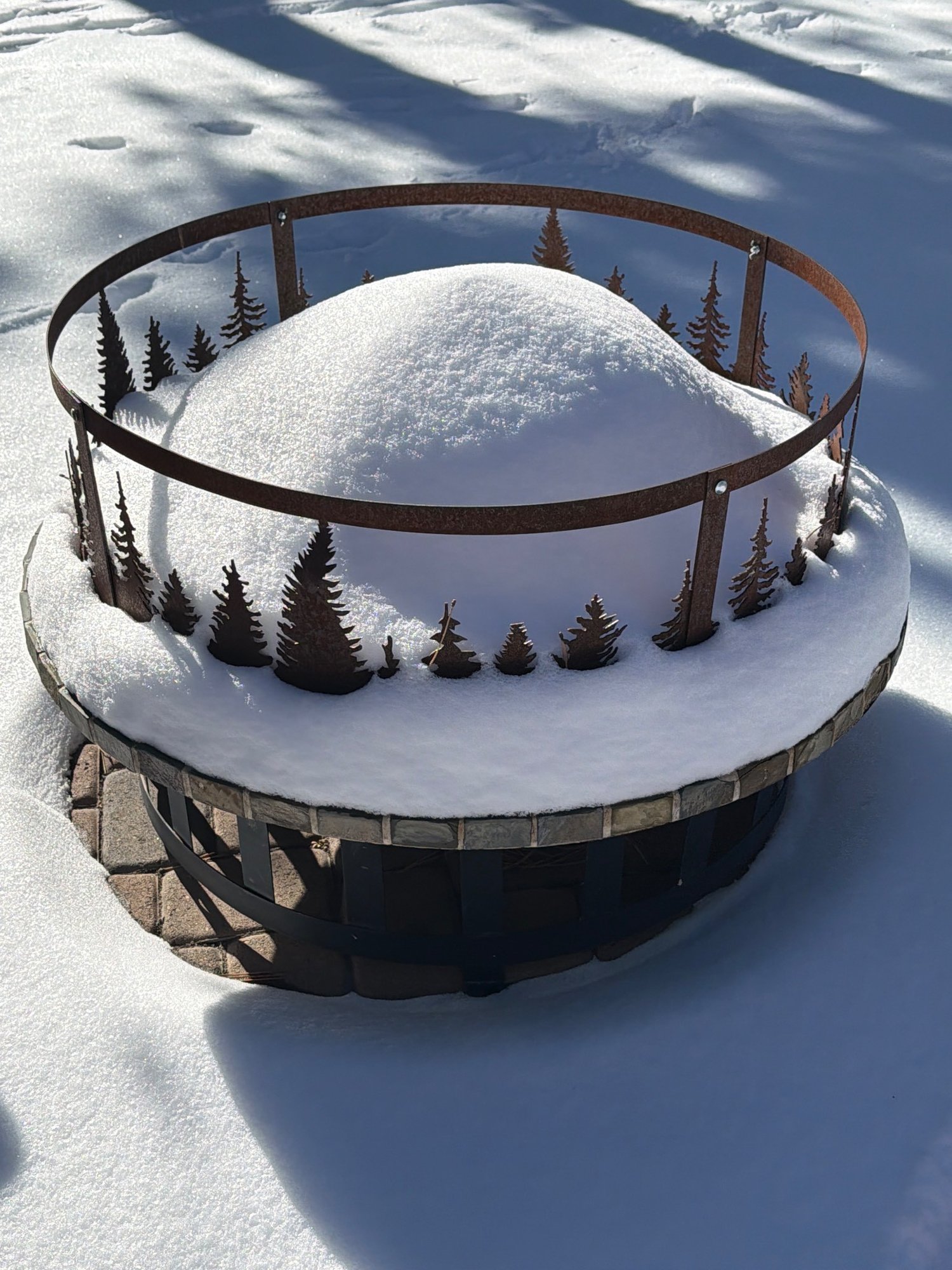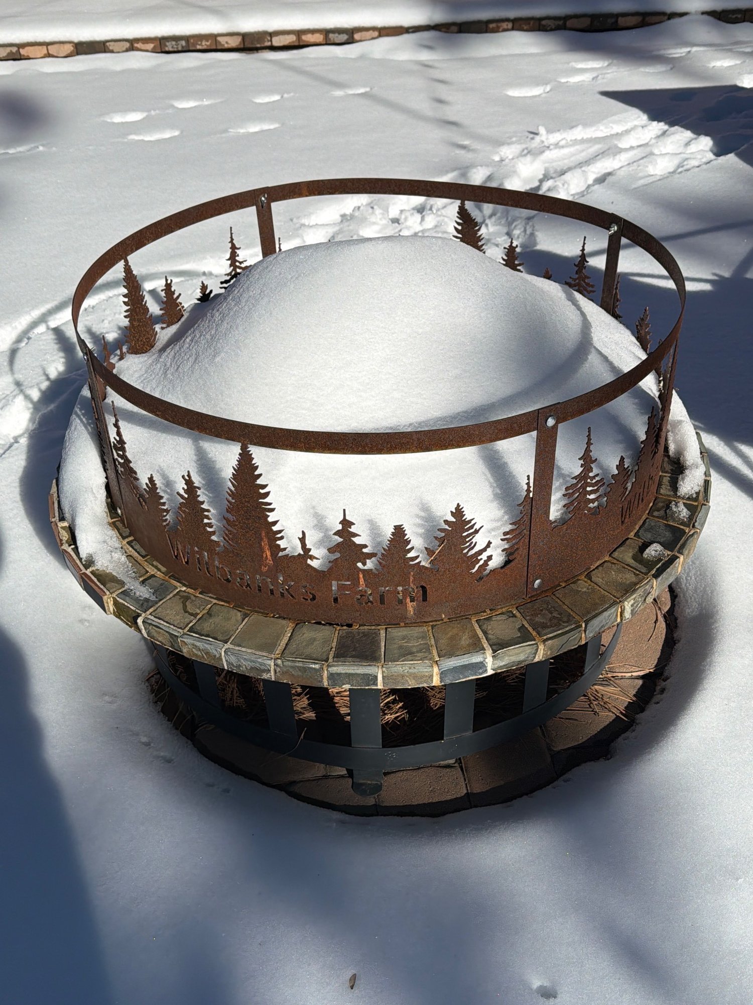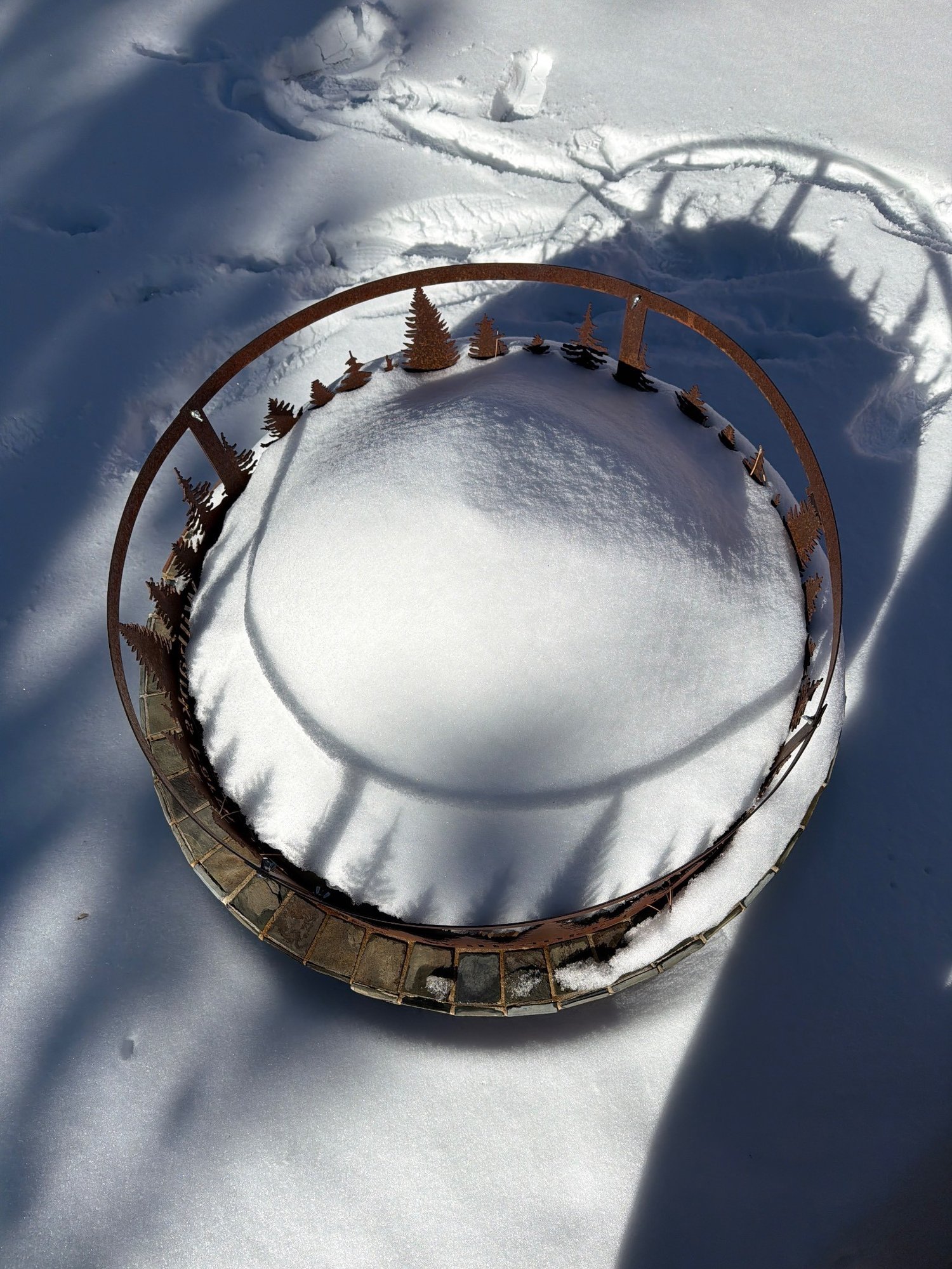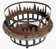Round steel fire pit featuring a decorative band with laser-cut forest motifs, including trees around the perimeter. The base consists of brickwork with metal strapping to support the structure. The fire pit is designed for outdoor use and shows a weathered patina. Approximate dimensions: 36 inches in diameter, 24 inches in height.