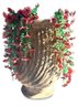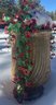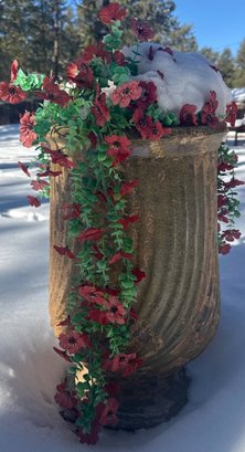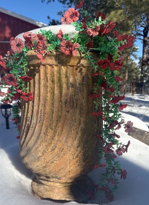 Fluted urn planter with a stone-like finish, featuring vertically ridged detailing throughout. Filled with artificial red flowers and green leaves partially covered in snow. Measures approximately 19 inches high and 12 inches in diameter.