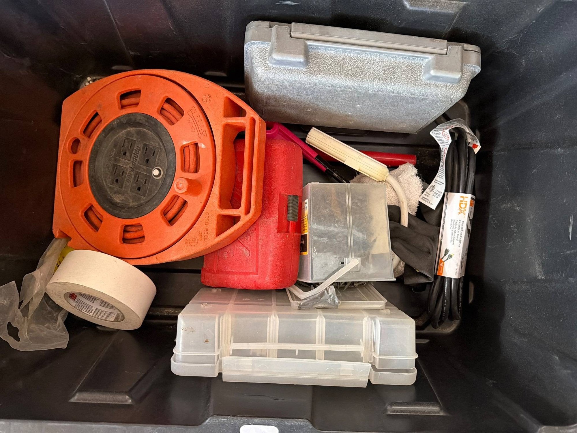 Yellow plastic storage bin containing various tools and accessories, including an orange extension cord reel, plastic organizer cases, duct tape roll, gloves, and other miscellaneous items. Bin has a handled lid with grid reinforcements. Dimensions of the bin are approximately 32 x 20 x 15 inches.