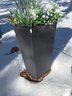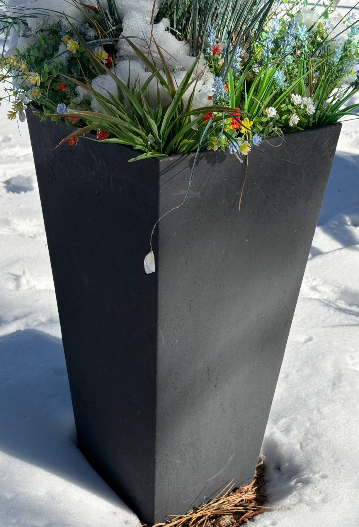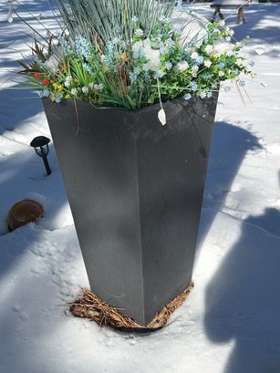 Black tapered planter containing artificial greenery with various plants and flowers, including ferns and other foliage. Snow covers parts of the planter and foliage. Appears designed for outdoor use. Dimensions: Approximately 13.5 inches in width by 27 inches in height.