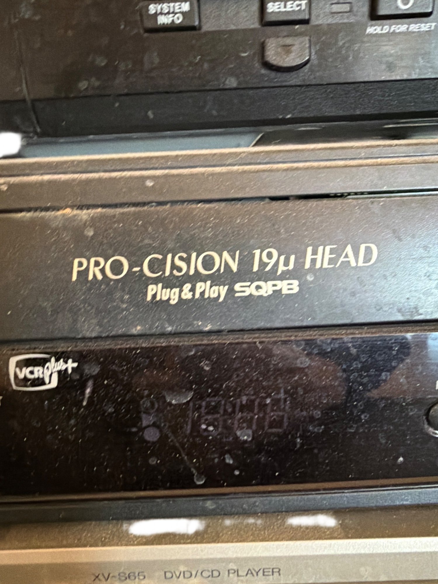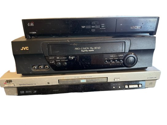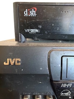This lot includes three pieces of home electronics equipment. The Dish Network VIP211K is a satellite receiver, the JVC Pro-Cision 19μ HEAD VCR supports HQ VHS playback and recording with SQRPB functionality, and the XV-S65 is a DVD/CD Player. Dimensions of the largest unit are approximately 17 inches in width as shown. Surfaces display signs of wear.