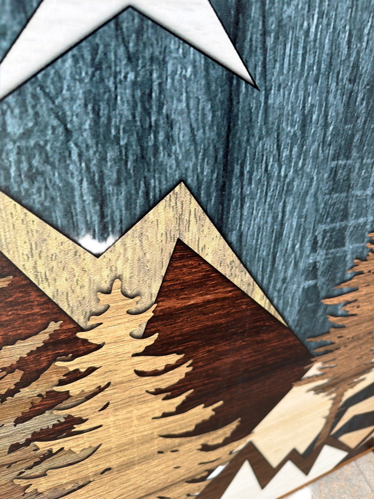 Three wooden wall panels featuring a stylized mountain landscape design. Composed of various wood tones, including warm brown, natural, and painted elements in blue and white. Each panel depicts coordinated alpine scenes with detailed tree and mountain motifs. Panels are framed in warm wood trim. Each panel measures approximately 36 inches in height and 24 inches in width.