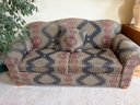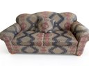 A three-seat fabric sofa featuring a geometric pattern with red, gray, and dark blue hues. Includes a single matching throw pillow. The sofa features gently curved armrests and wooden legs, as shown in the images. Approximate measurements: height 30 in, width 34 in, and length 76 in. Specific model or manufacturer not identified.