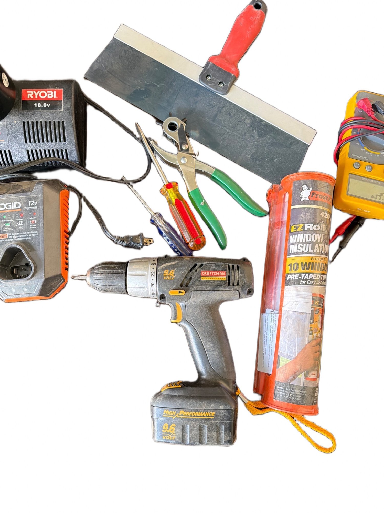 Tools including a Ridgid 18V cordless drill, compatible battery, and two chargers. Accessories include a multimeter, drywall taping knife, pliers, screwdrivers, and a tube of construction adhesive. Ideal for general tasks and projects. No dimensions provided.