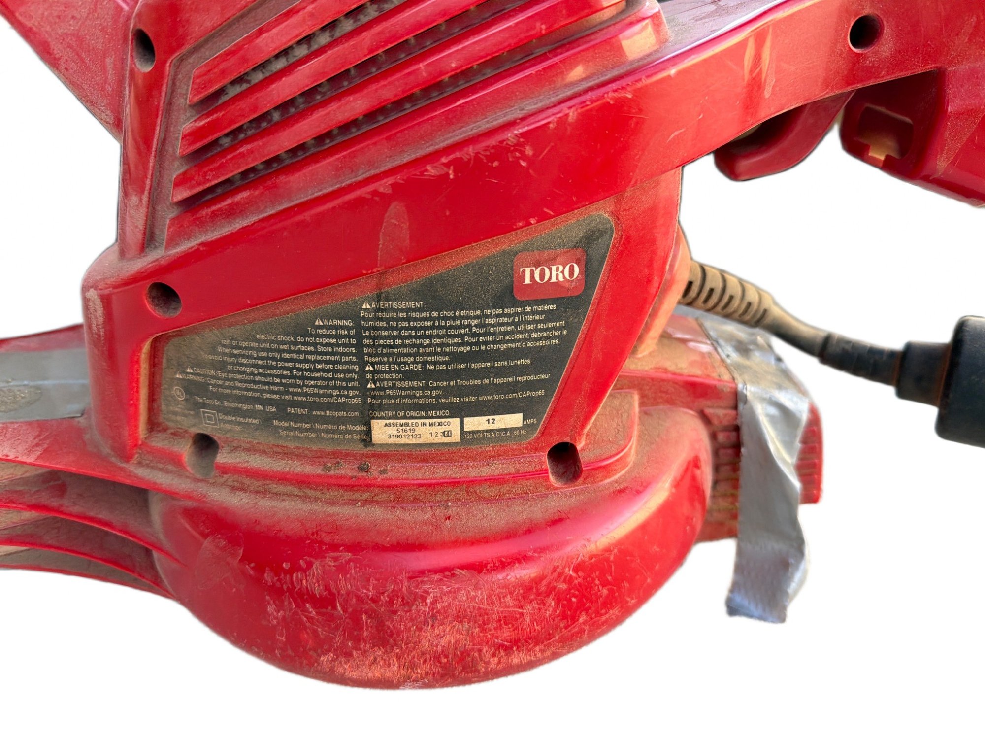Toro electric leaf blower and vacuum with additional attachments. Includes two black plastic tubes for use in vacuum or blower modes. The blower is red plastic with a corded electric power supply.