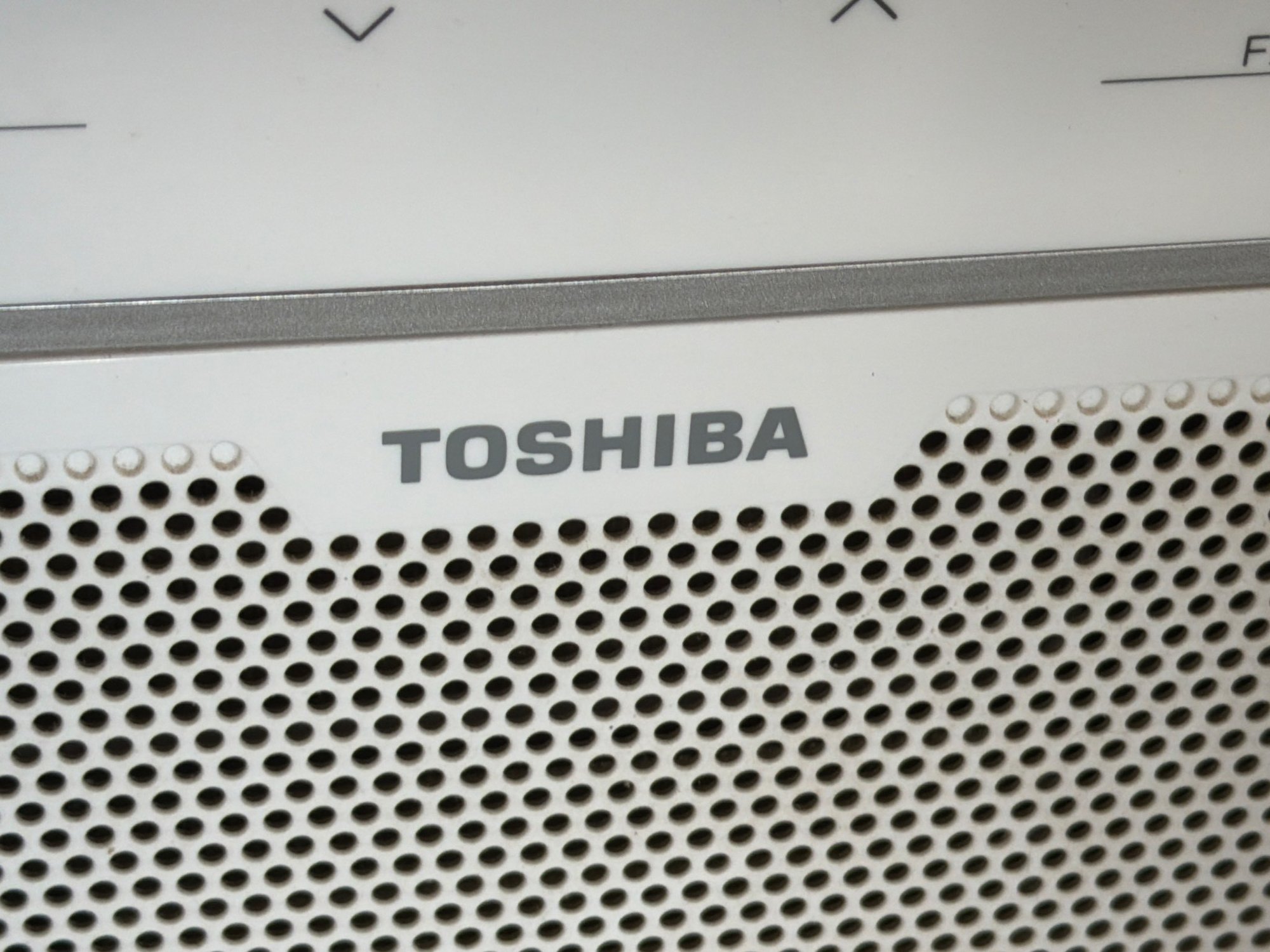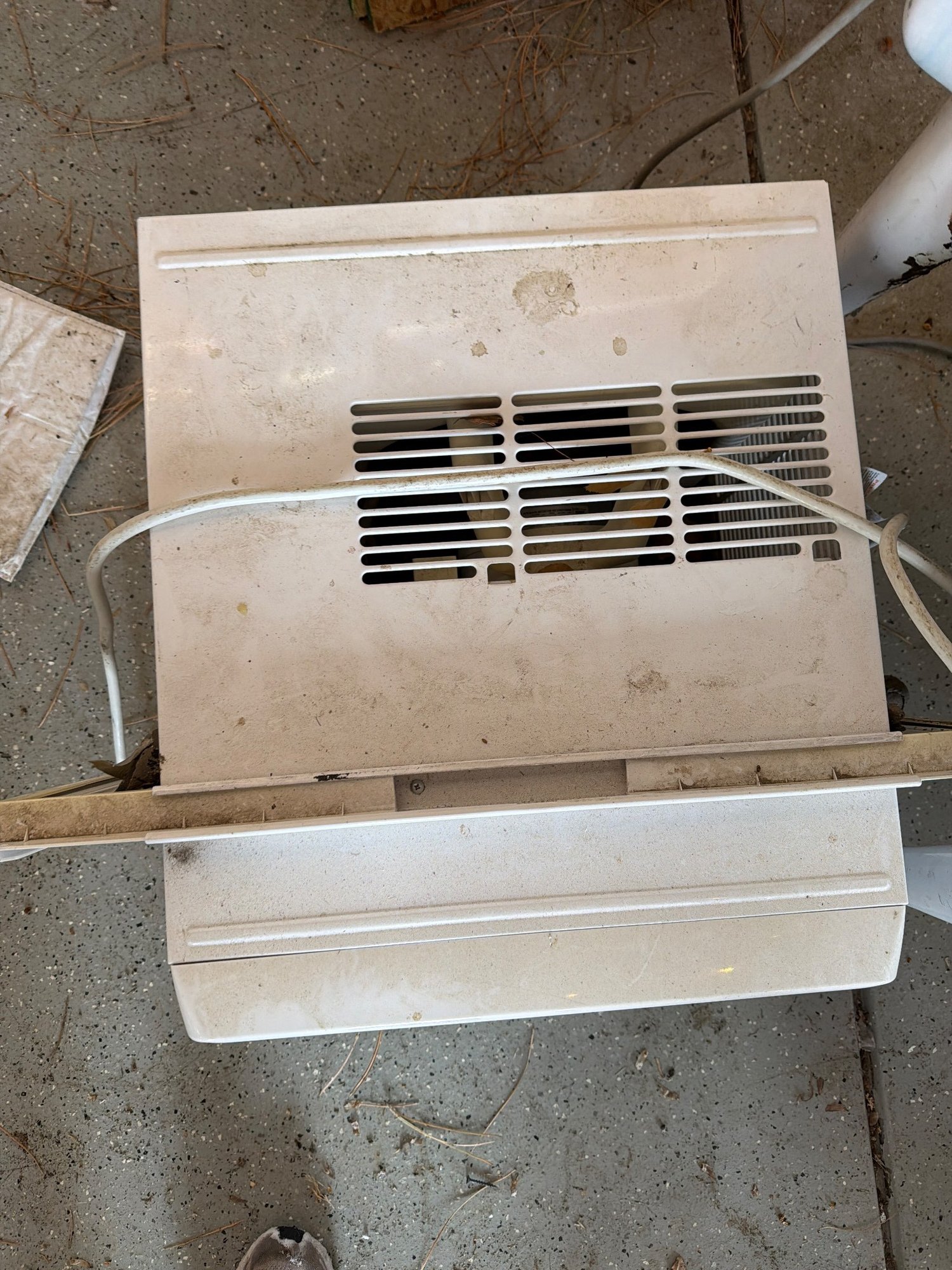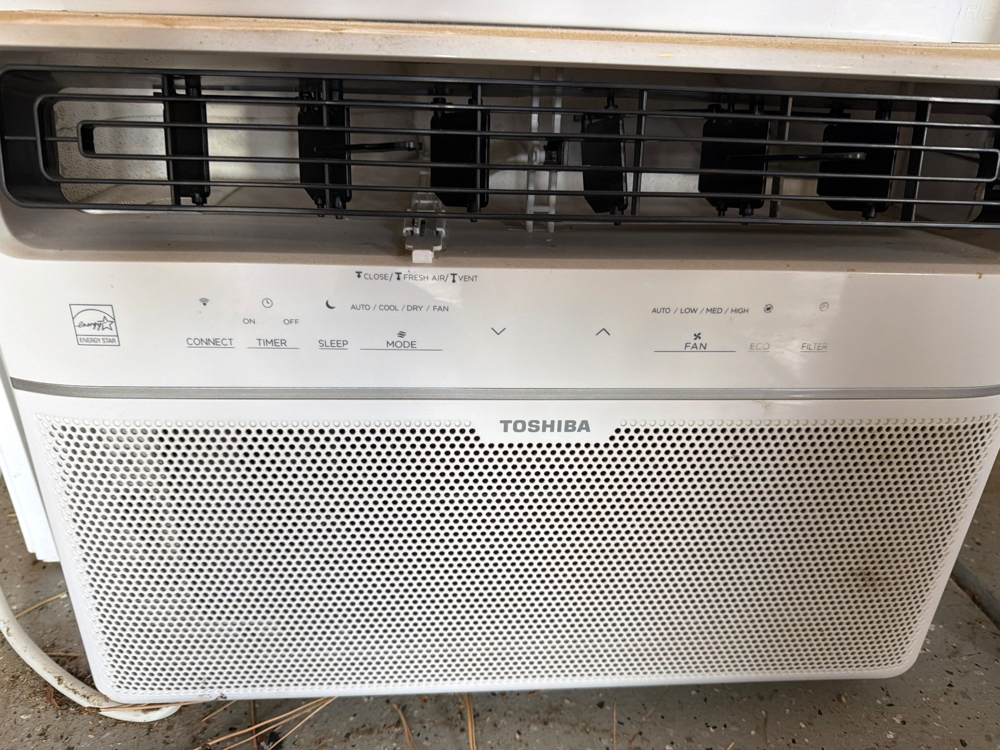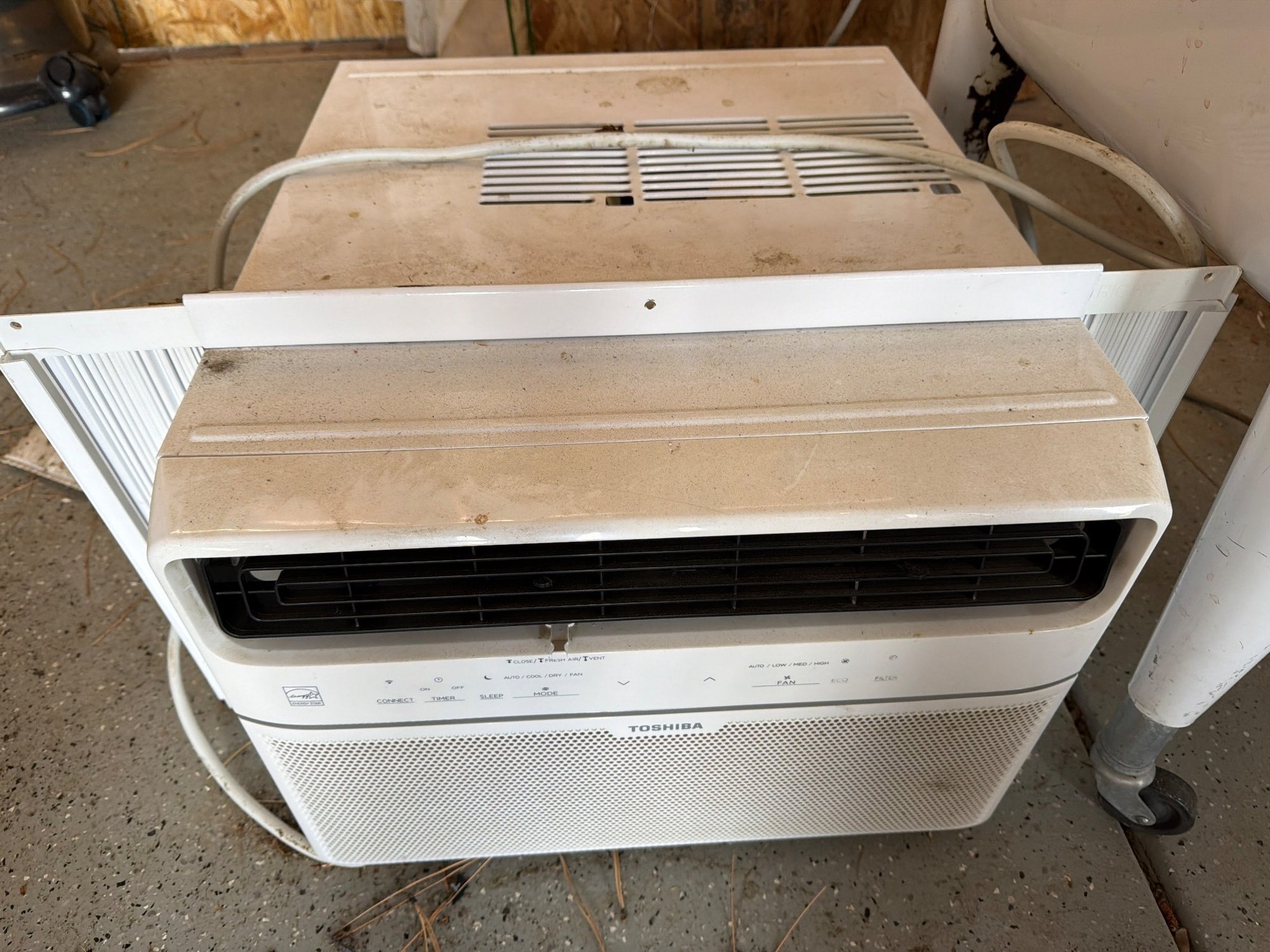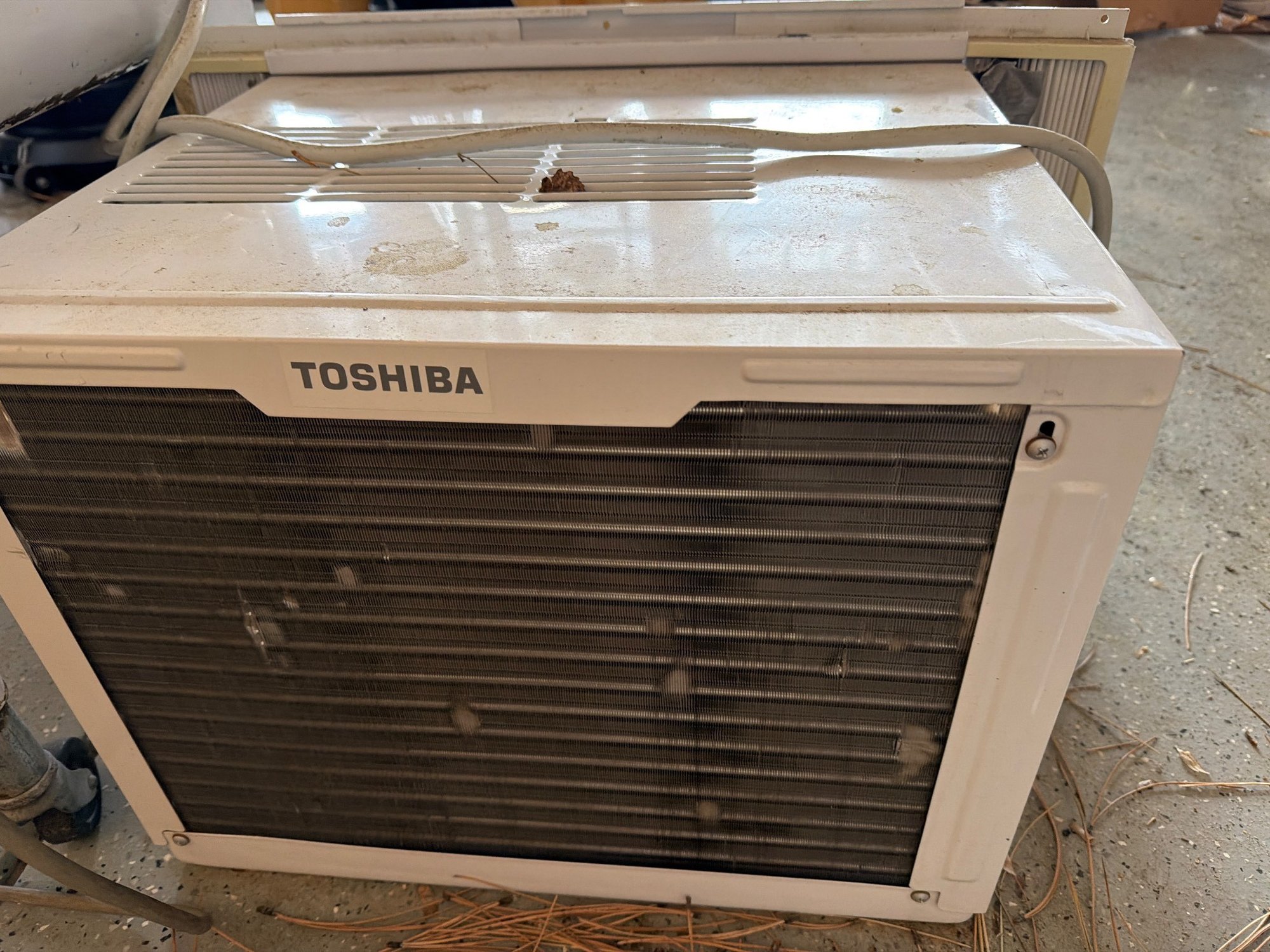 Toshiba window air conditioner with a built-in heat function, Model RAS-H08T2KCV. Features include adjustable louvers, control panel with function settings, and rear ventilation grates. Exterior shows signs of moderate wear, with some dust and minor surface blemishes visible. Power cable affixed. Dimensions: approximately 18 in W x 16 in D x 13 in H.