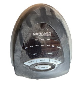 This is a tower-style ceramic space heater featuring a ceramic element, oscillation mode (OSC), a temperature dial, and a timer function. The heater has controls for power and modes on top of the unit. Corded electric power supply. Specific model and year of manufacture are not visible in the images. Evidence of use is present, and the item appears functional. Further testing recommended.