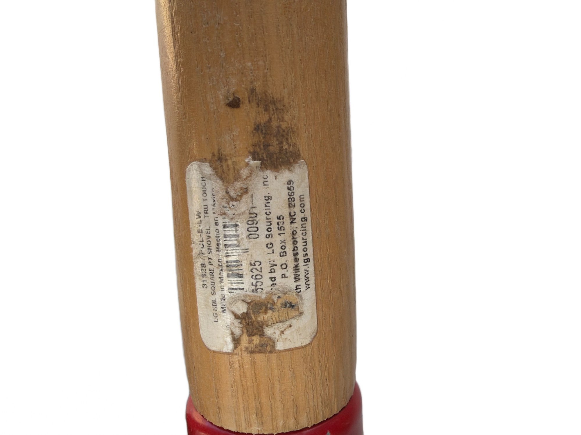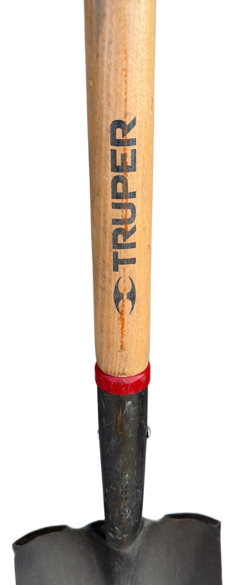 Truper square point shovel featuring a sturdy wooden handle and metal blade. The handle is labeled with the Truper brand, and additional product details are visible on the label affixed to the handle. The shovel's length measures approximately 58 inches.