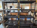 This listing features a set of two durable black plastic storage shelving units with five tiers each. Each shelf is supported by a sturdy frame made from plastic for lightweight yet robust storage support. Ideal for garages, workshops, or other storage needs. Each unit measures approximately 36 inches wide, 18 inches deep, and 72 inches tall.