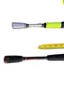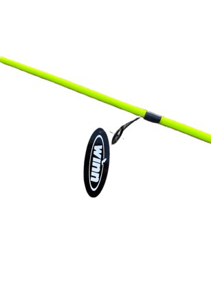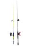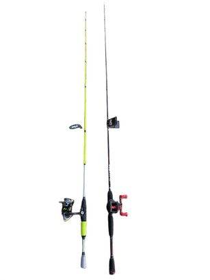 Two fishing rods with reels. The first is a brightly colored rod featuring a Winn tag, designed with a cushioned grip. The second rod is an Abu Garcia Black Max model, distinguished by a black and red design with a labeled reel. Both rods are fully intact and functional. Dimensions are approximately 72 inches and 77 inches, respectively.