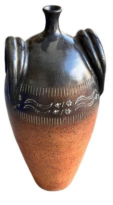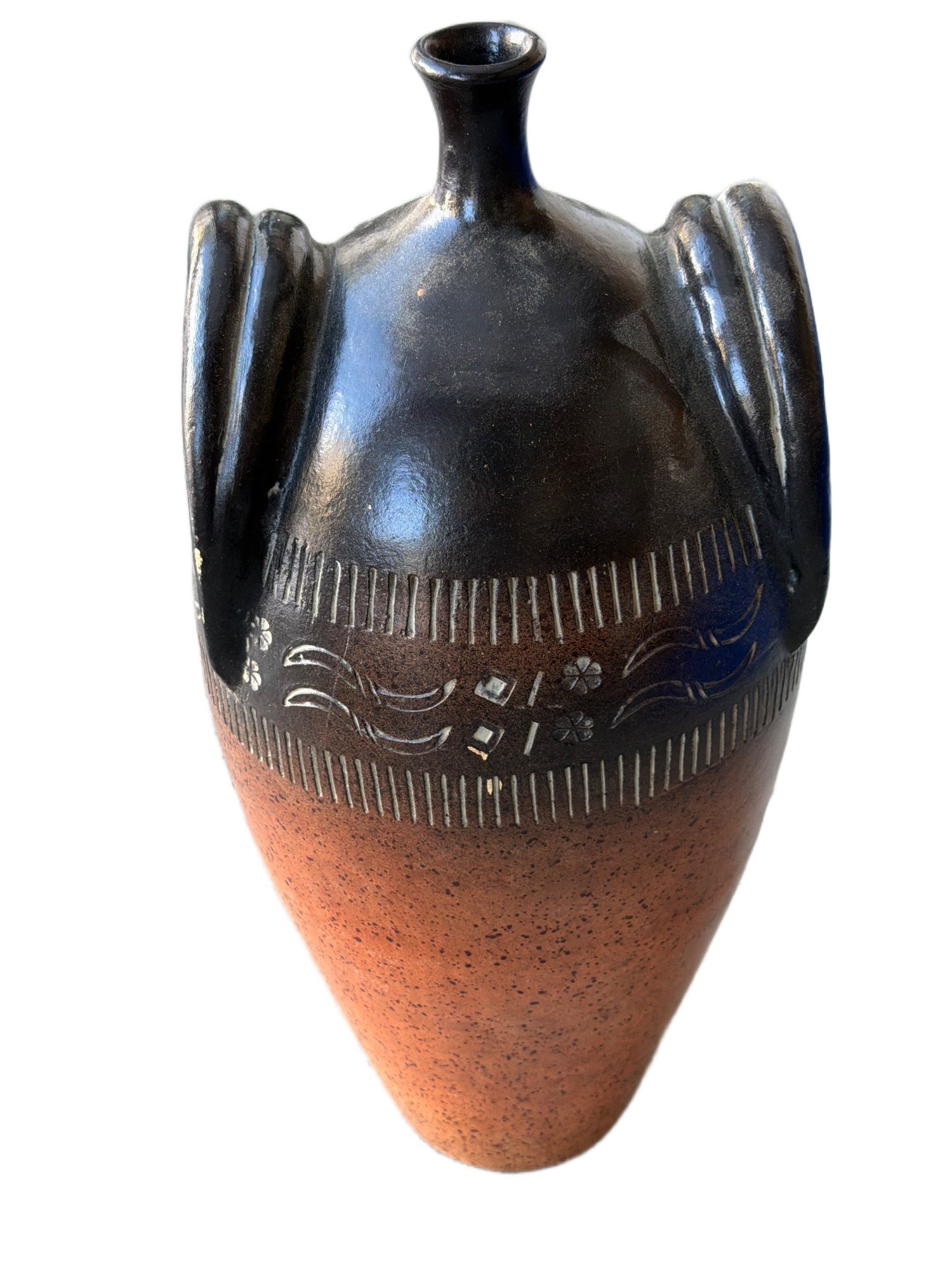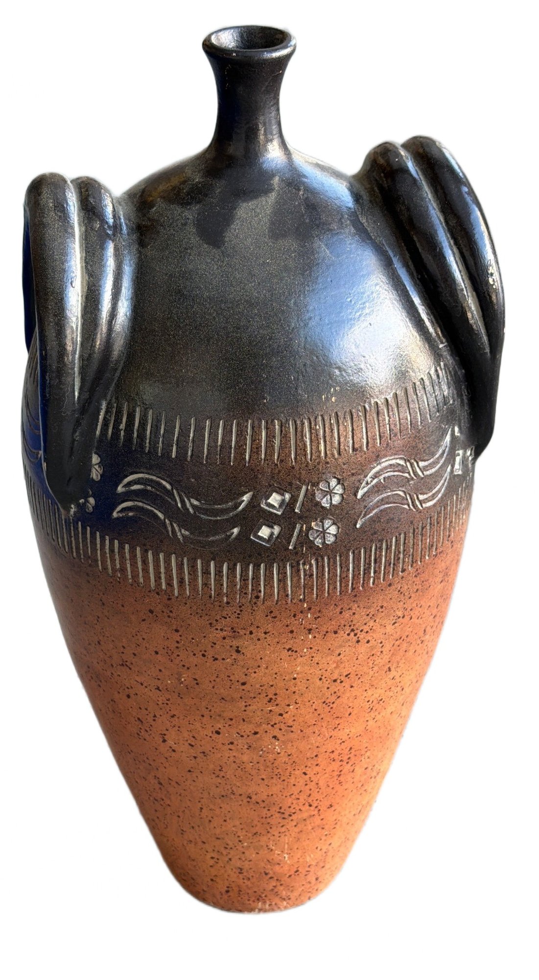 Ceramic vase featuring a two-tone glaze with a speckled terracotta lower section and a dark glossy black upper section. The vase is adorned with an incised decorative band displaying a floral motif and wavy lines around the midsection. Two applied loop handles are present, extending vertically along the sides, and the piece is finished with a narrow neck and small flared rim. Dimensions: Approximately 16 inches in height and 8 inches in width, as measured with the visual scale.