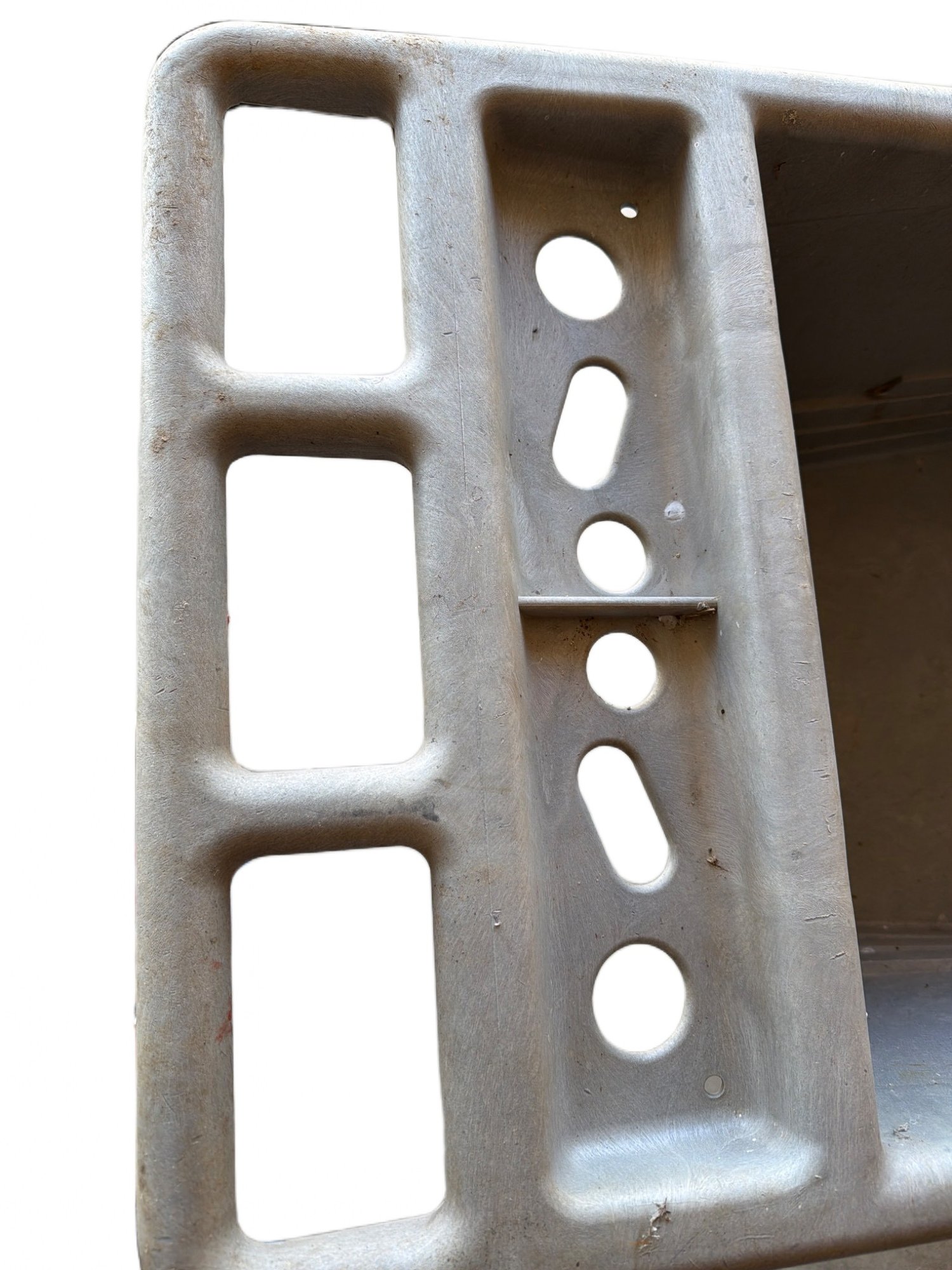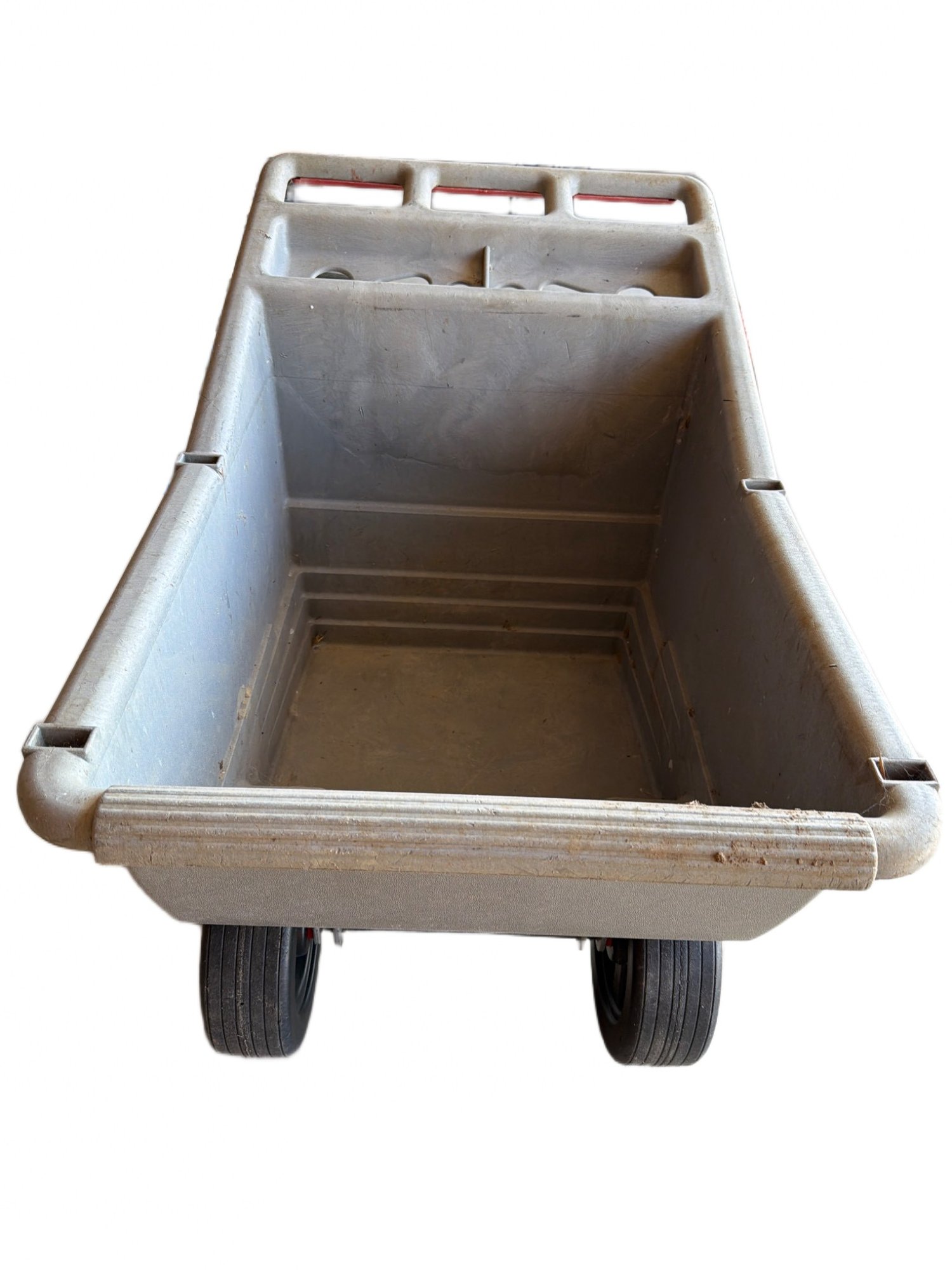 This is a two-wheeled industrial-grade utility cart constructed from heavy-duty plastic. It features molded compartments for organizational purposes and two durable wheels for maneuverability. Likely designed for commercial or industrial use, it includes ergonomic handles for ease of movement. The specific manufacturer or model is unknown.