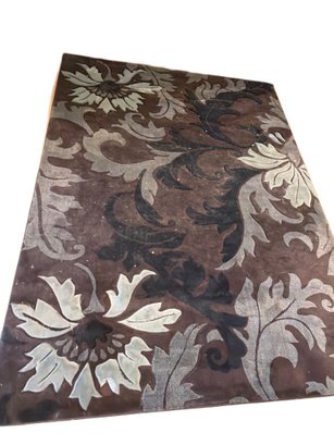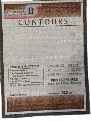 United Weavers of America Contours collection area rug. Model features 100% olefin pile, stain, soil, and fade-resistant material. Dimensions are 7'10" x 10'6" (240 cm x 320 cm) with a total weight of 46.5 lbs. Made in Turkey. Care instructions include vacuuming regularly, using a professional cleaner or spot cleaning with mild detergent, and avoiding saturation or dry cleaning. Visible Pet Hair present on rug.
