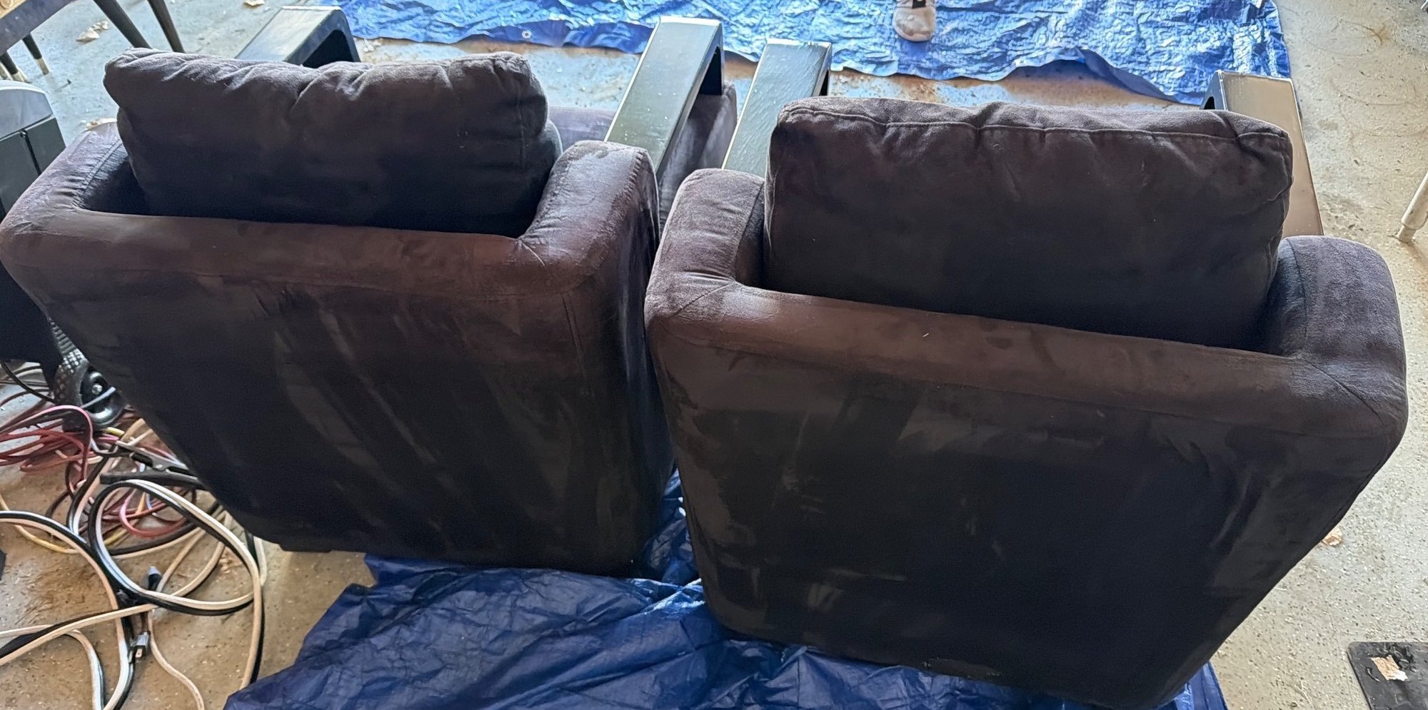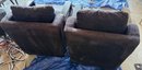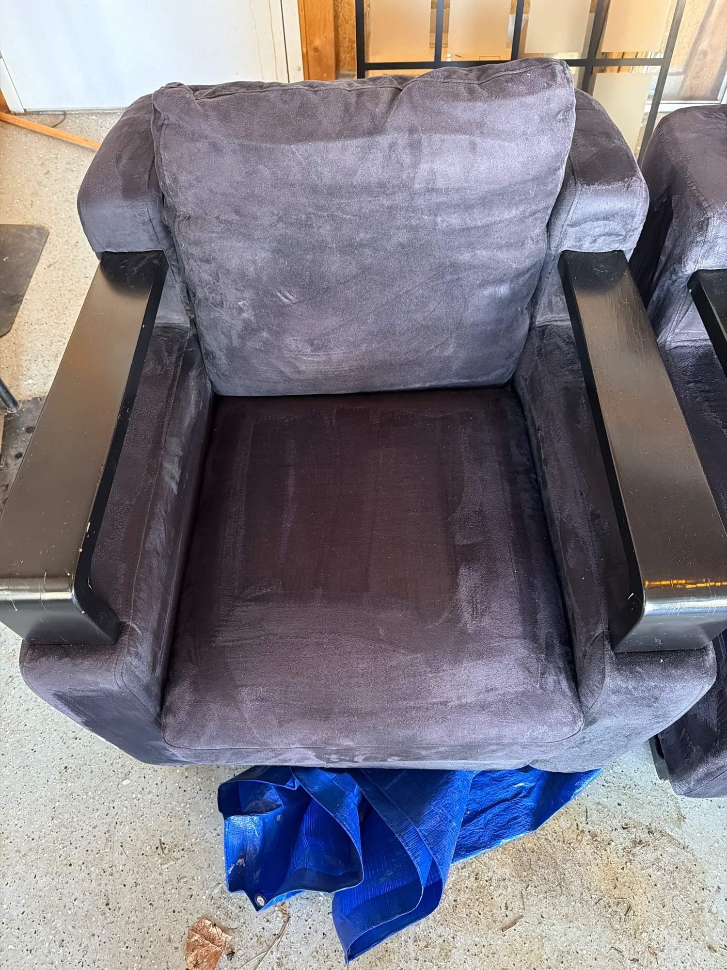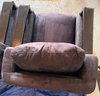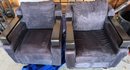 Armchairs featuring purple plush fabric upholstery and black wooden armrests. Each chair includes a removable cushion for the backrest and seat. The square form is complemented by flat, smooth armrests. Visible wear on fabric and wood consistent with usage. Dimensions: Approximately 34 inches in height, 32 inches in width, and 29 inches in depth.