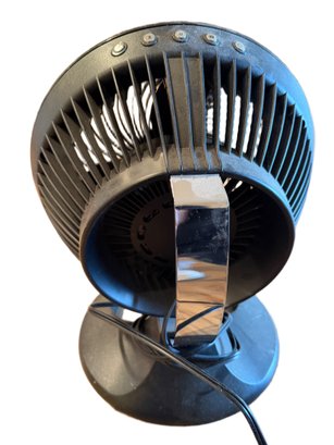 This is a Vornado table fan featuring a circular blade design for efficient airflow. The unit includes adjustable tilt capabilities and multiple power settings. The fan operates via a standard plug-in electric cord and is constructed with a sturdy plastic frame and a polished metal handle. The exact model and year of manufacture are not specified.