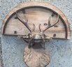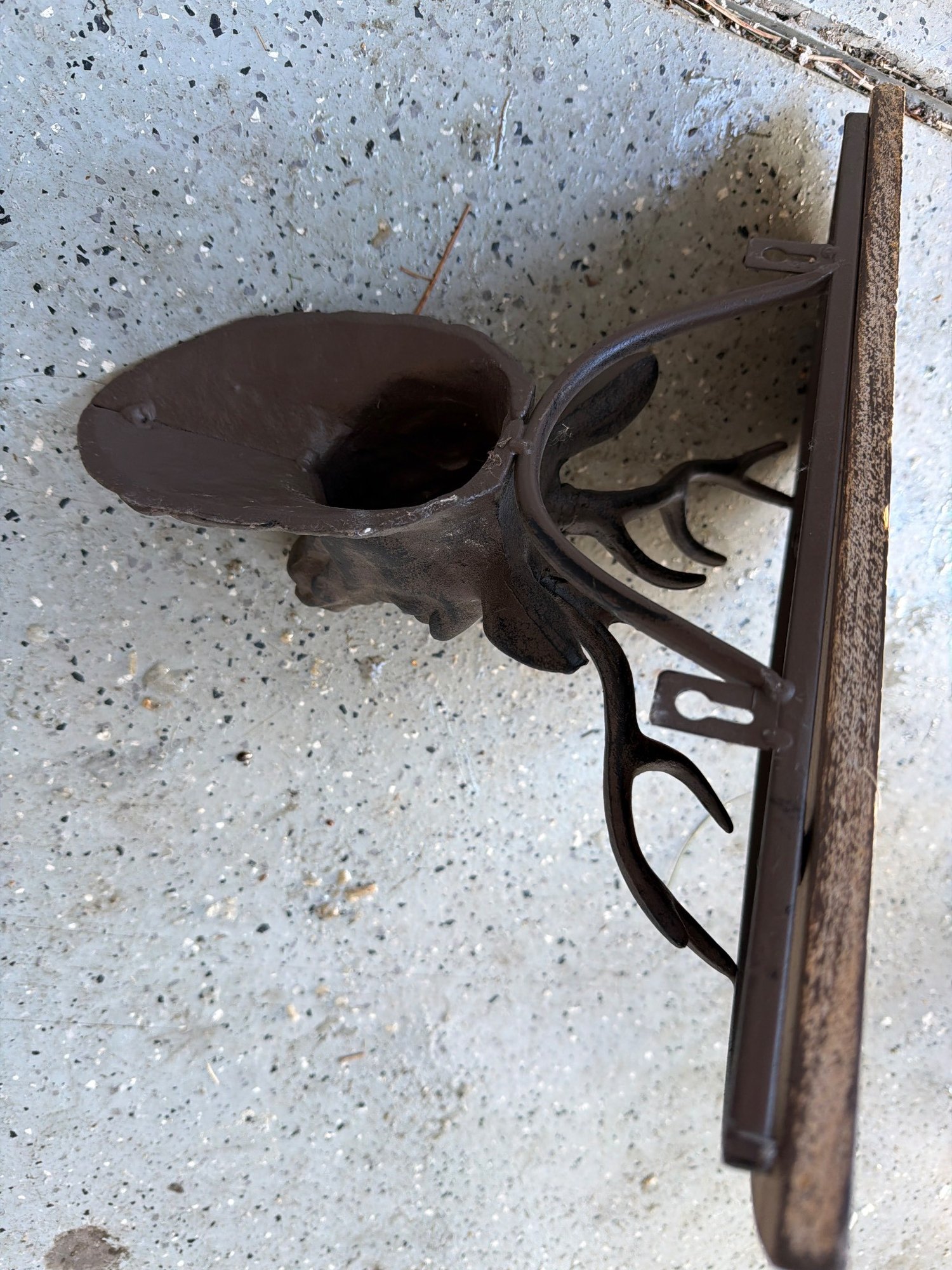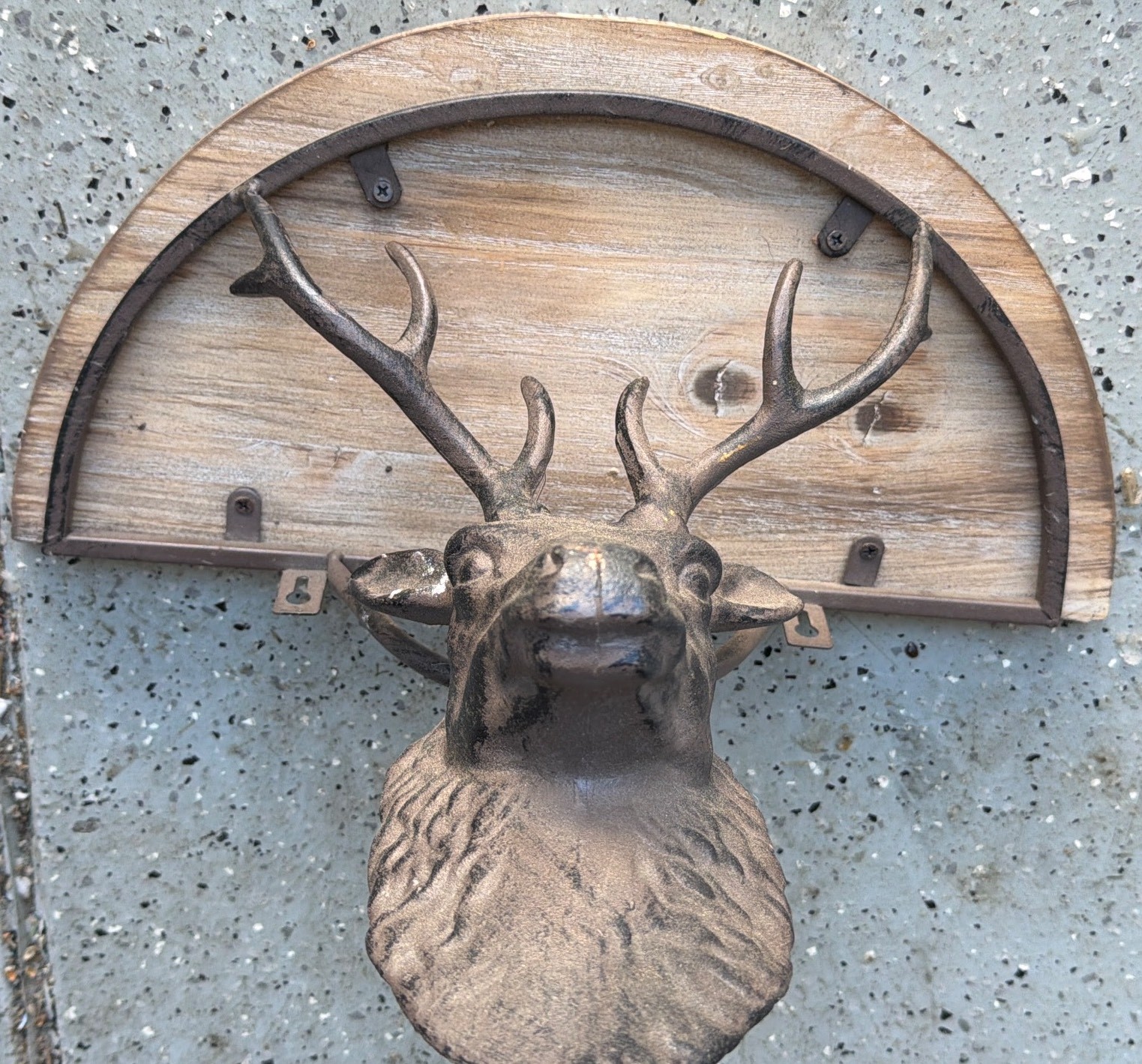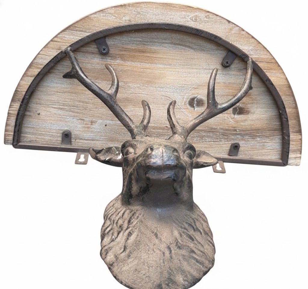 Wall-mounted decor piece featuring a metal deer head with antlers attached to a semi-circular wooden base. The base displays a distressed wood finish and includes mounting hardware slots on the back. Ideal for use as a decorative hook or wall accent. Dimensions: Approximately 11 inches wide, 8 inches tall, and 7 inches deep.