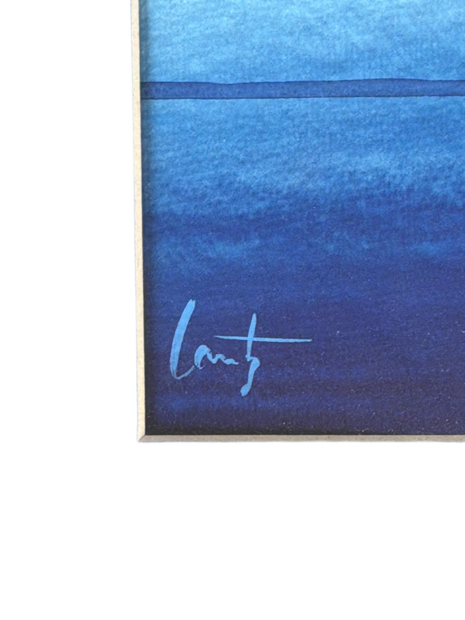Watercolor painting titled 'Moonlit Flight' by Charles Lantz, featuring an ethereal blue night scene with a moonlit sky, seagulls, and a light reflection on water. The work is hand-signed by the artist in the lower left corner. Framed with a blue matboard and protected under glass. Accompanied by a certificate of authenticity from Patrician Publications, Inc., noting it as an original hand-signed piece. Frame dimensions: 16 inches high x 12 inches wide.