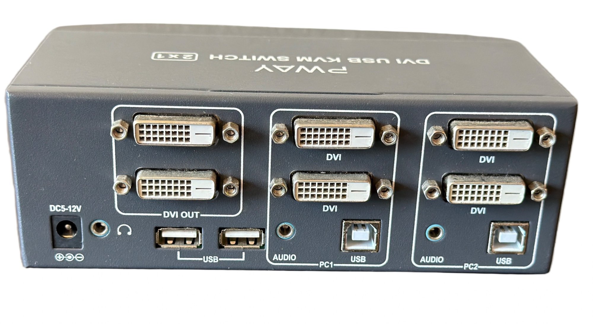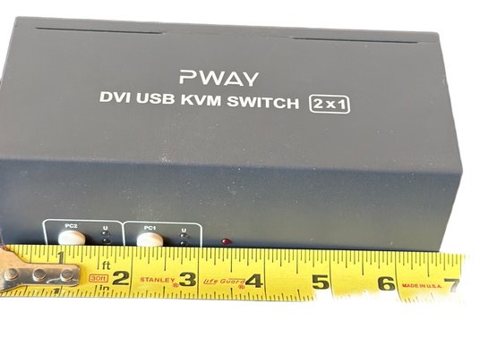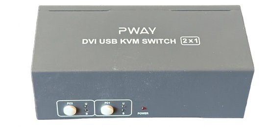 PWAY DVI USB KVM Switch, model 2x1. Features two DVI inputs, two USB inputs, audio ports, a DVI output, and a DC 12V power connection. Designed for switching between two computers using a single set of peripherals. Comes with interface buttons on the front panel. Dimensions: approximately 5.25 inches wide, 2.75 inches deep, and 1.5 inches tall.