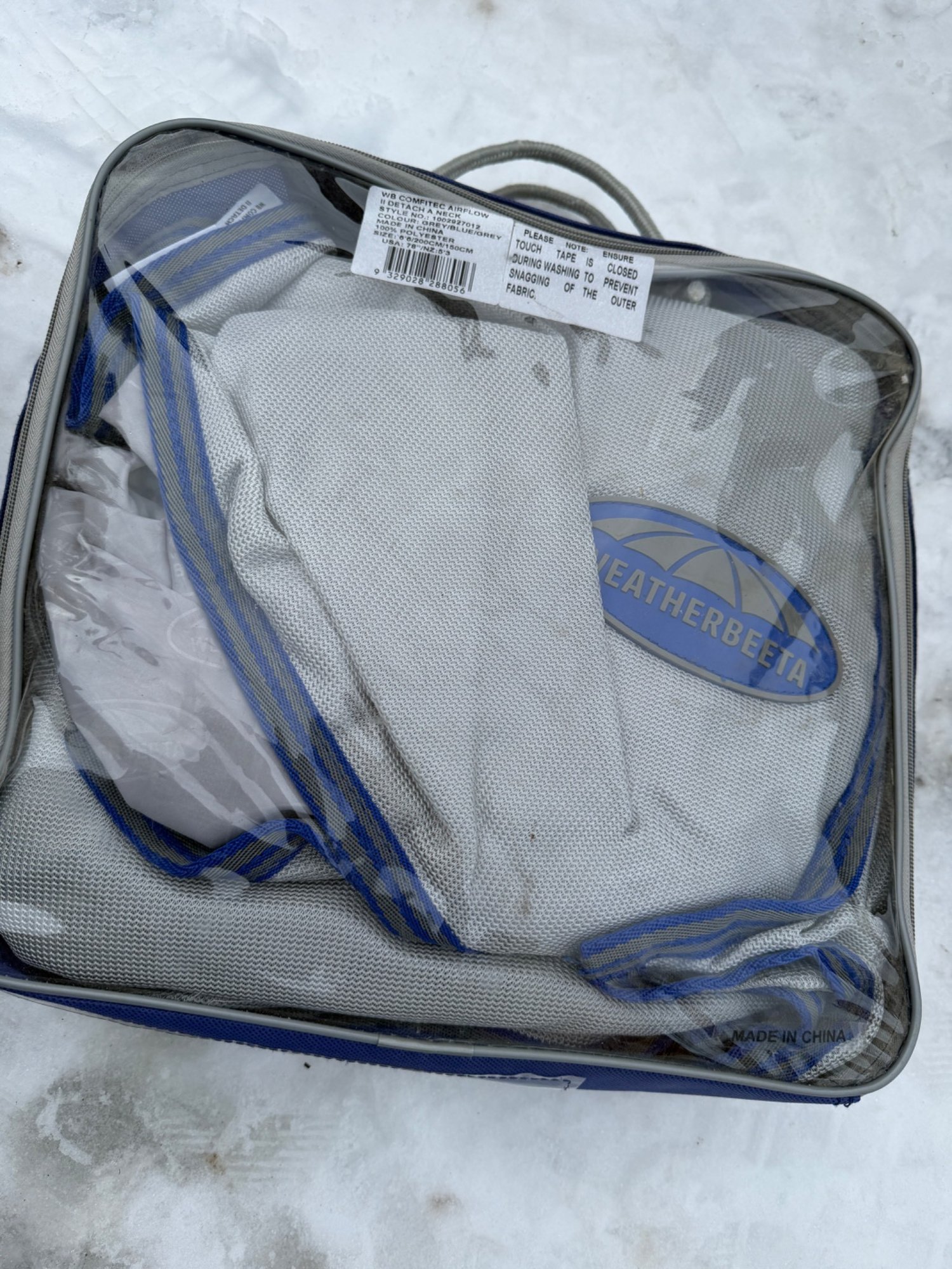 The WeatherBeeta ComFiTec Dura Mesh Detach-A-Neck horse sheet offers a practical and protective covering for equines. Featuring a durable gray and blue mesh design, this sheet is designed to provide comfort and protection. It is a UK size 6’6″, USA size 78″, Euro 150/200 cm, and NZ size 5’3″. The detachable neck adds adaptability to various weather conditions. Original packaging shows minor handling wear but includes all labeled details. Dimensions: Size 6’6″ (USA 78″).