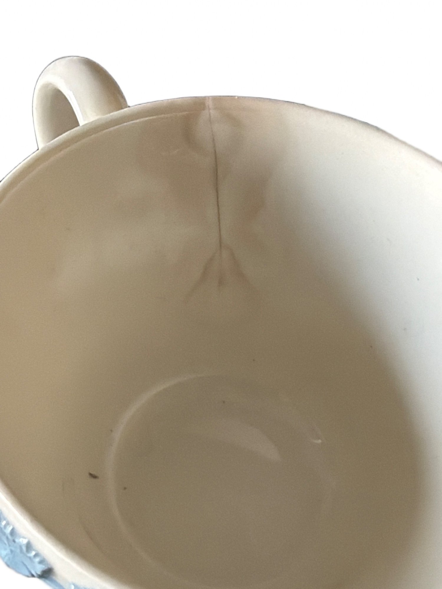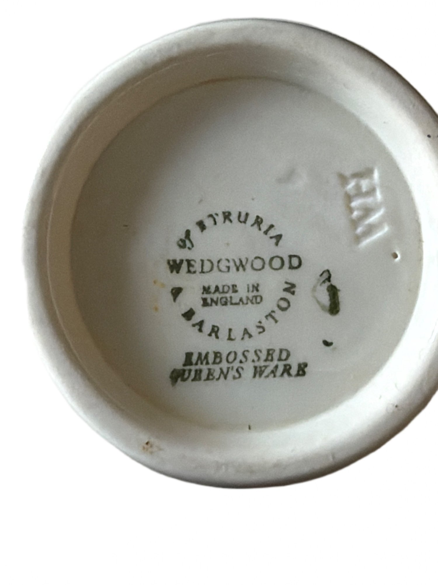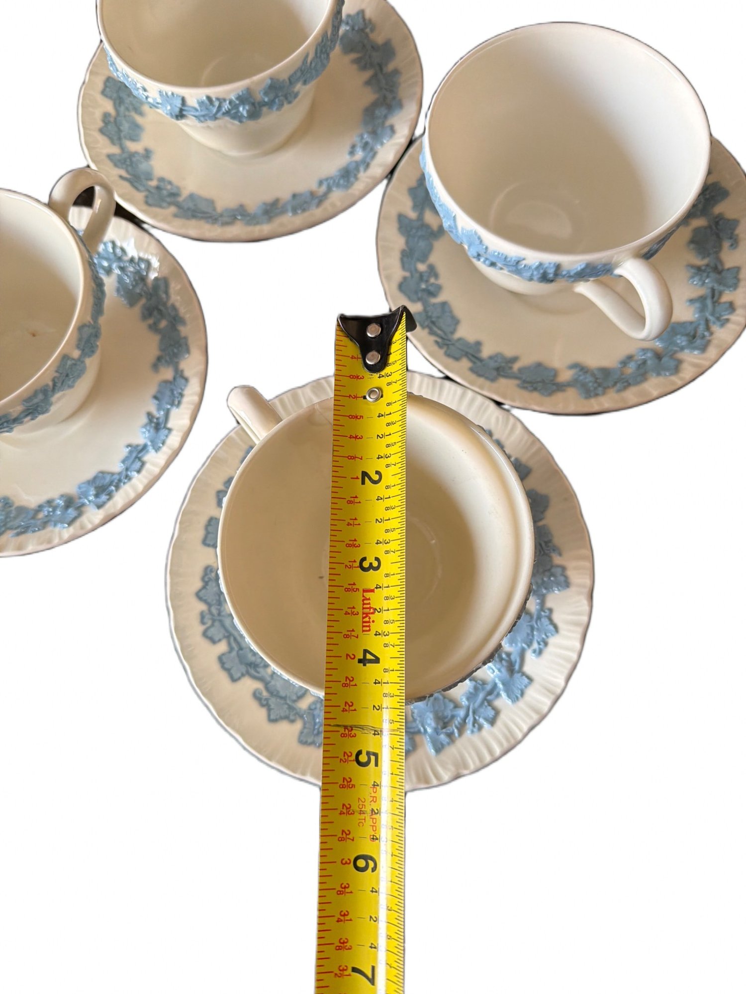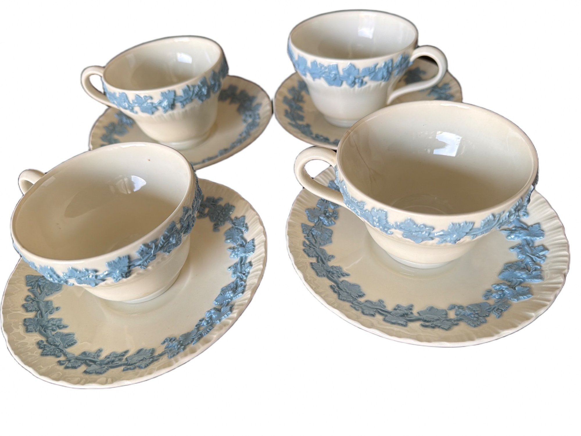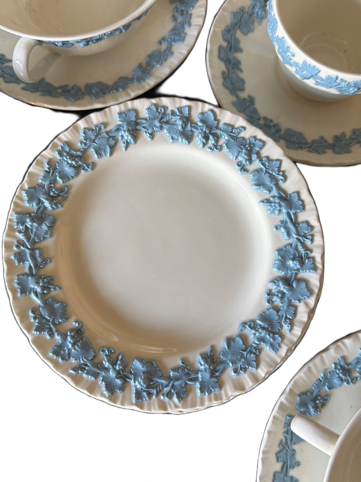 Tea set by Wedgwood in Embossed Queens Ware pattern, featuring white ceramic bodies and blue floral relief designs. Made in England. Set includes multiple teacups, saucers, plates, and additional serving items. One cup shows a visible crack on the interior. Measurements: saucer diameter approximately 6 inches.